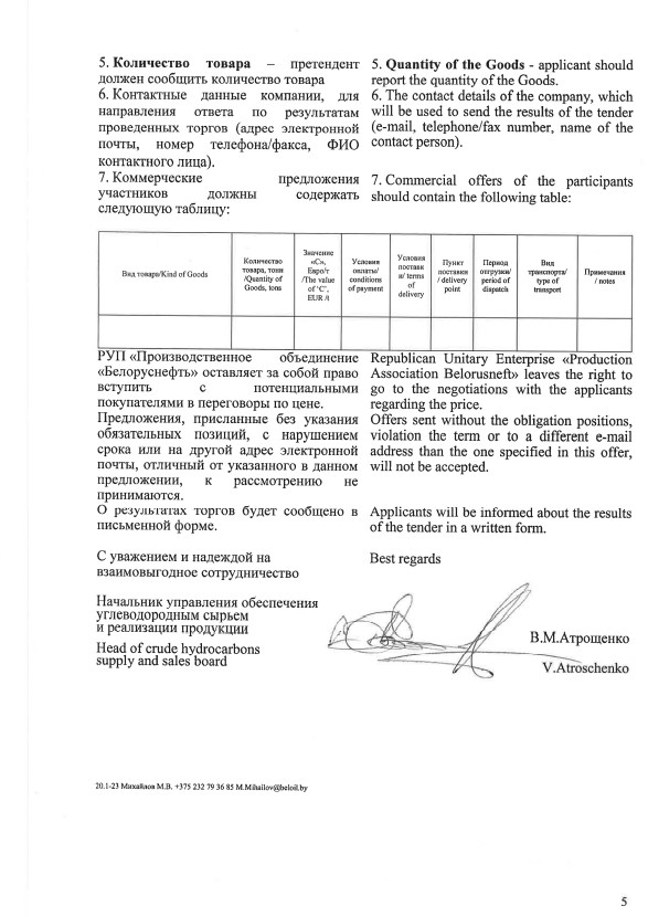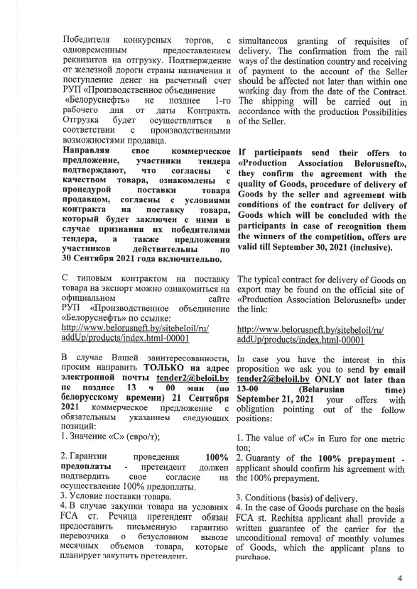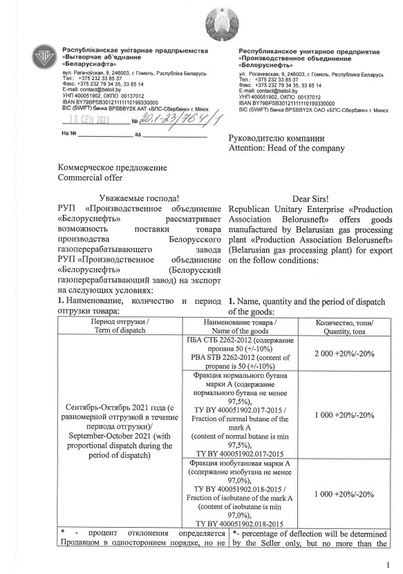 «Белоруснефть» объявила конкурс предложений на спотовые партии сжиженного газа отгрузкой в течение сентября-октября 2021 г.. К реализации представлено 2 тыс. т ПБА производства Речицкого ГПЗ, и по 1 тыс. т нормального бутана и изобутана.