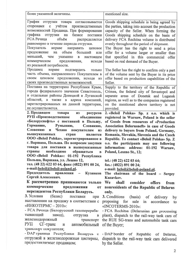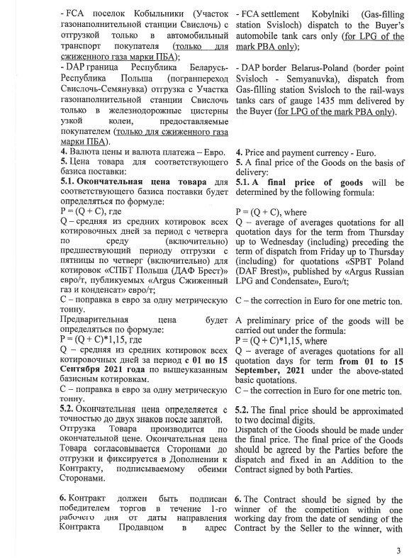 Ресурс предлагается на условиях самовывоза с завода производителя - FCA Речица. Формульное цеообразование предусматривает привязку к котировке DAF Brest Propane-Butane публикуемой ценовым агетством Argus.
