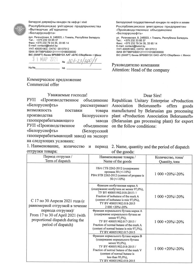 «Белоруснефть» объявила конкурс предложений на спотовые партии сжиженного газа отгрузкой в течение 17-30 апреля 2021 г.. К реализации представлены 1 тыс. т ПБА производства Речицкого ГПЗ, 1 тыс. т изобутана и 2 тыс. т нормального бутана (марки А и В).