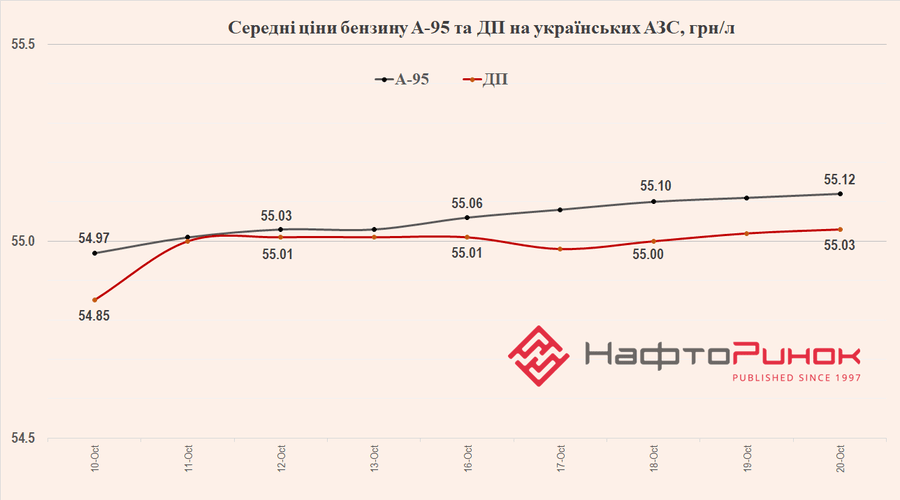 Середня ціна бензину А-95 дрібним гуртом зменшилася на 0,94 грн (-2,0%) до 46,43 грн/л протягом 10-20 жовтня, дизельного пального – збільшилася на 0,83 грн (+1,7%) до 50,18 грн/л. Проте на українських АЗС вартість усіх видів пального продовжує зростати: ДП – на 0,18 грн/л до 55,03 грн/л, А-95 – на 0,15 грн/л до 55,12 грн/л.