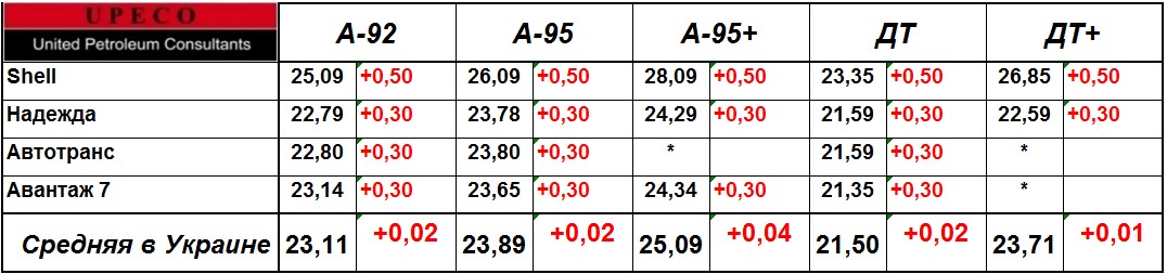 Таким образом, средняя стоимость бензинов и ДТ в рознице выросла на 1-4 коп./л, до следующих отметок: А-92 – 23,11 грн/л, А-95 – 23,89 грн/л, А-95 Премиум – 25,09 грн/л, ДТ – 21,50 грн/л и ДТ Премиум – 23,71 грн/л.