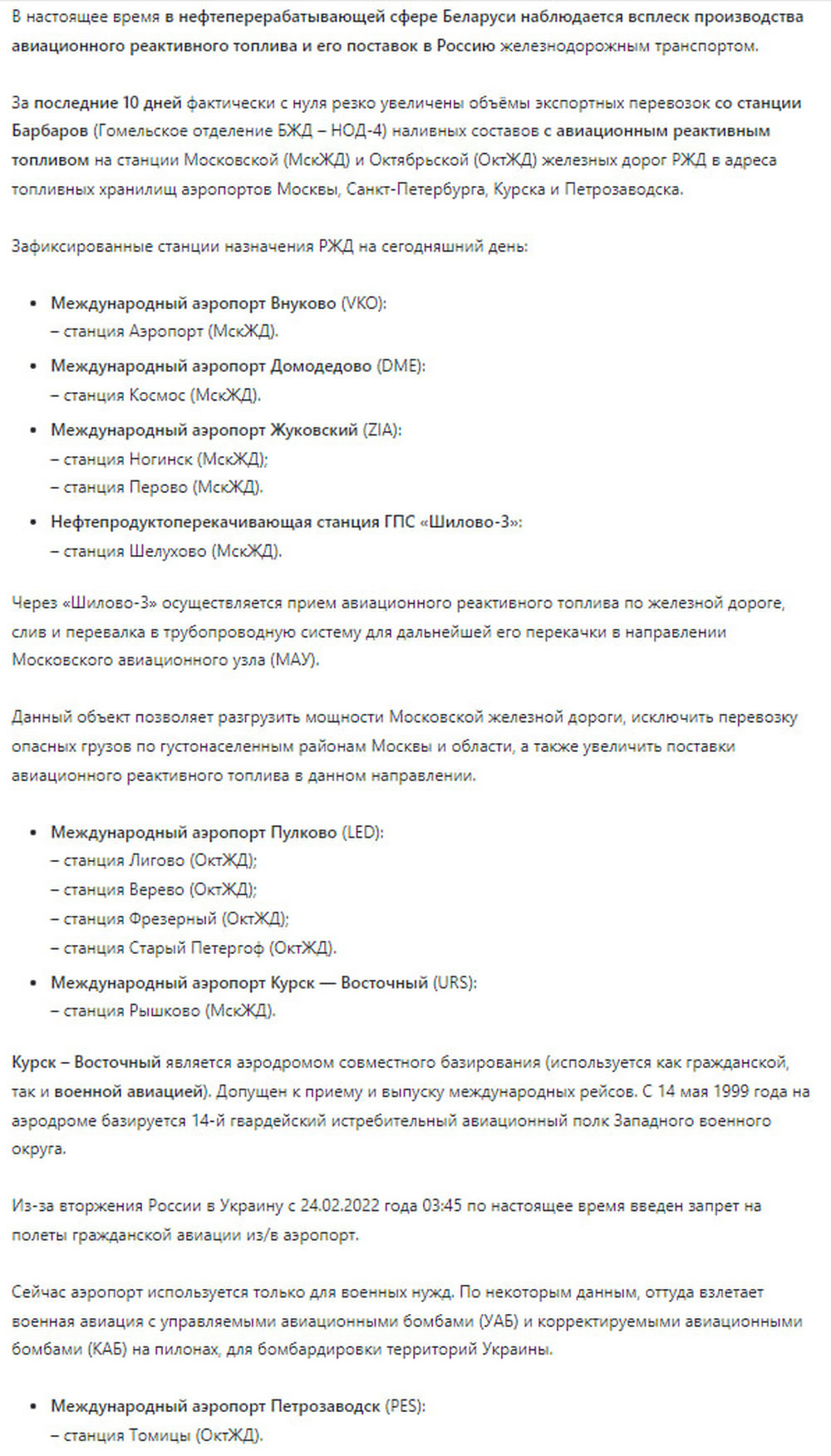 «За останні 10 днів фактично з нуля різко збільшено обсяги експортних перевезень зі станції Барбаров (Гомельське відділення БЖД) наливних потягів з авіаційним реактивним паливом до станцій Московської (МскЗ) і Жовтневої (ОктЗ) РЖД на адреси паливних сховищ аеропортів Москви, Санкт-Петербурга, Курська і Петрозаводська», — йдеться у повідомленні.