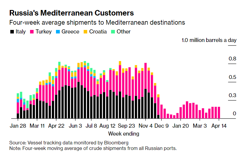 Протягом чотирьох тижнів до 14 квітня морські поставки сирої нафти з РФ до європейських країн залишався стабільним на рівні 83 тис. барелів на добу, а єдиним пунктом призначення була Болгарія.