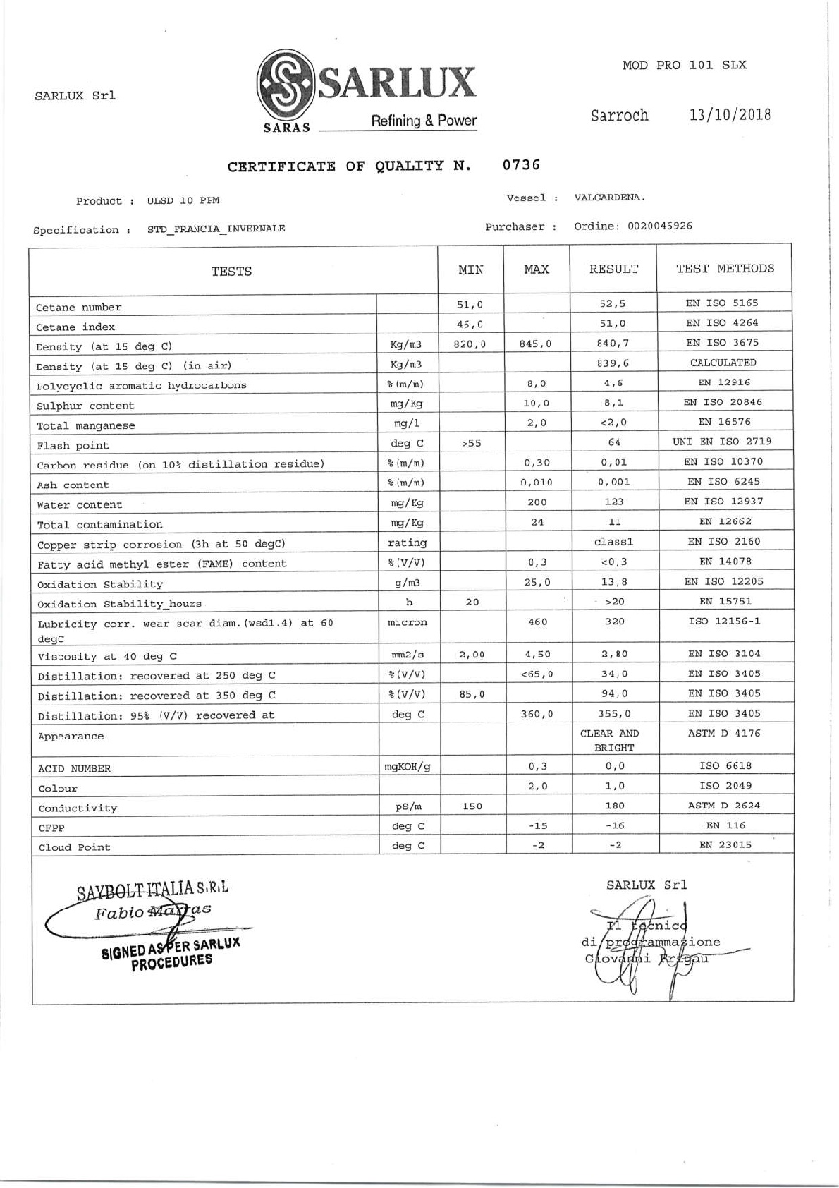 На перевалку поступило более 33 тыс. т дизельного топлива стандарта Евро-5. Производителем ДТ является итальянская компания Sarlux, которая управляет НПЗ Sarroch на о. Сицилия мощностью 15 млн т в год. Поставщиком дизтоплива выступила BP Oil International Ltd.