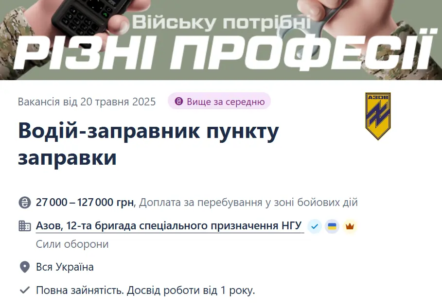 Бригада «Азов» НГУ шукає фахівців в батальйони та інші підрозділи, зокрема потребує водіїв-заправників пункту заправки.