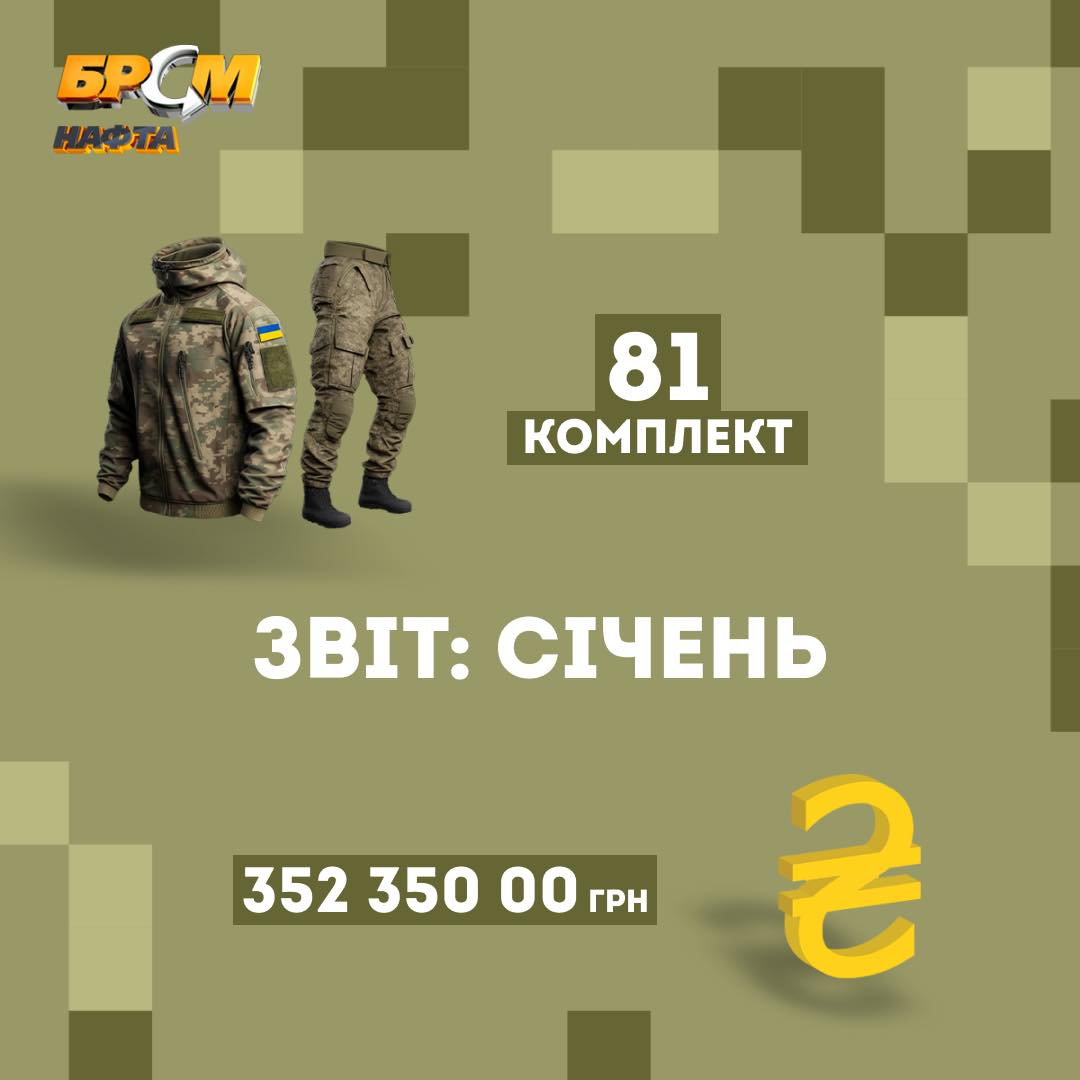 “Наразі ми зібрали майже мільйон гривень і не плануємо зупинятися!” - повідомили в “БРСМ”. Компанія також повідомила, що в січні вже передала захисникам 81 комплект теплого військового одягу вартістю 352,35 тис. грн. Його отримали бійці ДФТГ «Хартія», м. Харків (30 комплектів); 129 бригада ТРО, 7 батальйон УДА, Запорізька обл. (10 комплектів); ДУК «Правий сектор» (10 комплектів); 16 ОБрАА, Полтавська обл. (20 комплектів); А1376 бригада 58, 2 стрілецький батальйон, підрозділ розвідки (11 комплектів).