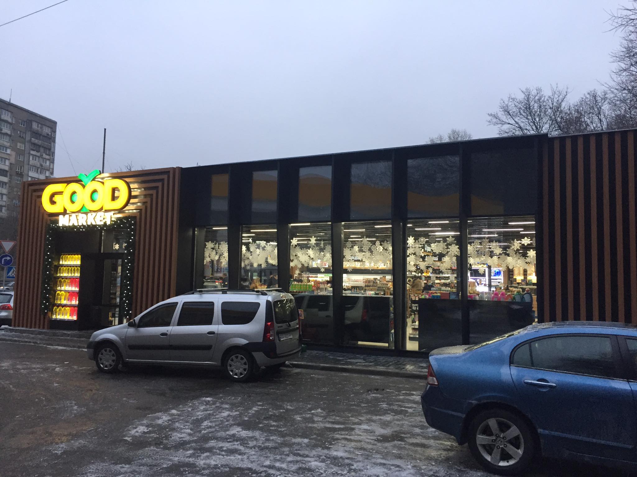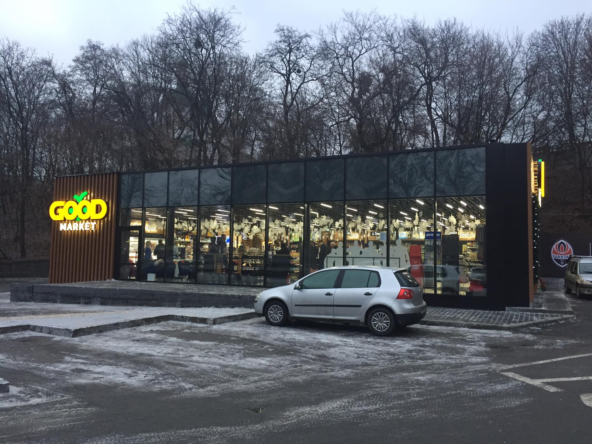 Станция расположена на ул. Елены Телиги, 12-Б. Это 200-я станция и седьмой супермаркет в сети .