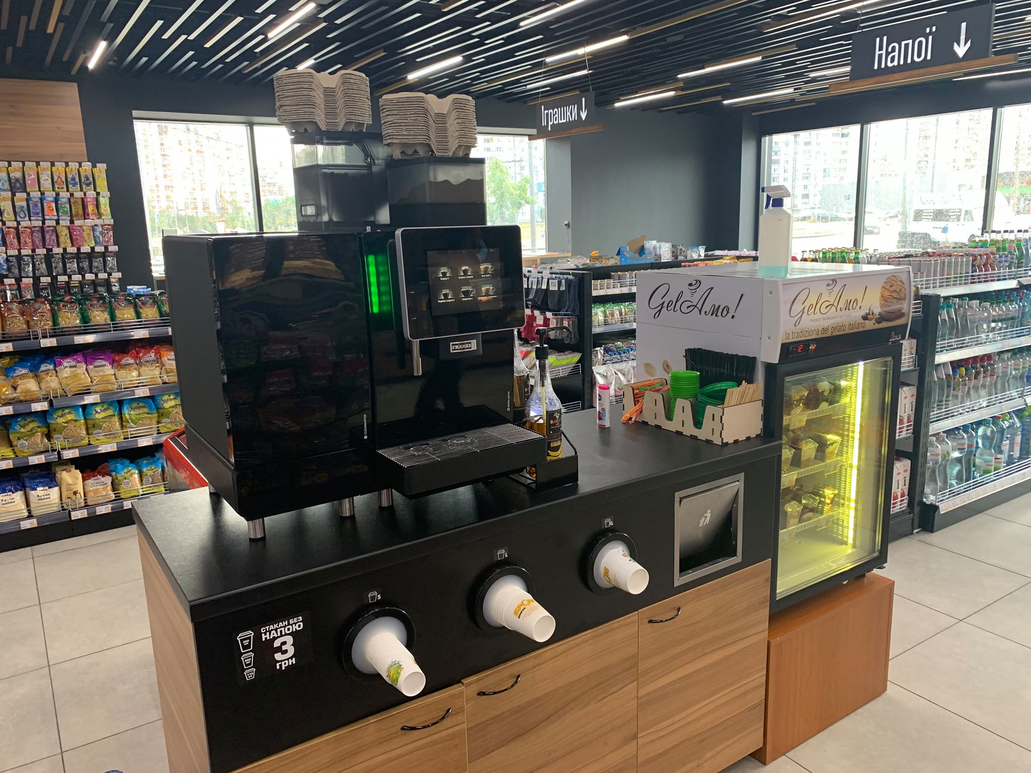 Площадь магазина – 280 м2. Кроме того, на станции есть обменный пункт, кафе с широким ассортиментом предложения по фаст-фуду (пицца, бургеры, хот-доги, сендвичи, салаты и т.д), строится летняя терраса. Установлена кофемашина марки Franke A600. Отметим, что данная станция входит в 20-ку АЗК с предложением итальянского мороженого Gel’Amo.