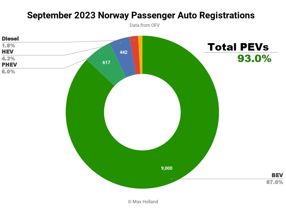 На акумуляторні електромобілі у вересні припадало 87% усіх реєстрацій авто у Норвегії, на PHEV (гібриди, що заряджаються від електромережі) – 6%, на інші гібриди– 4,3%, на дизельні авто – 1,8%. У вересні 2022 року на BEV припадало 77,7% реєстрацій, на PHEV – 11,4%. Це означає, що BEV зайняли ще майже 10% ринку за рахунок всіх інших типів авто.