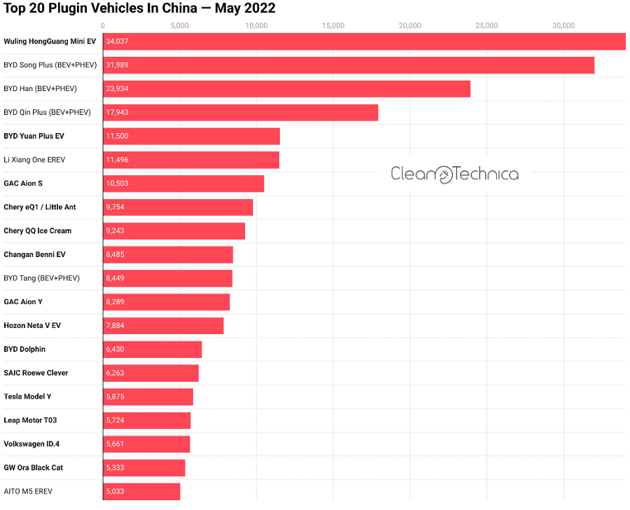 Абсолютним бестселлером травня став дешевий і компактний електрокар Wuling HongGuang Mini EV з 34 тис. реєстрацій. Всі інші моделі в першій п’ятірці - марки BYD. На цього автовиробника припадає 28% продажів електрокарів в Китаї. Водночас частка Tesla в травні становила лише 6,6% на тлі низьких продажів.