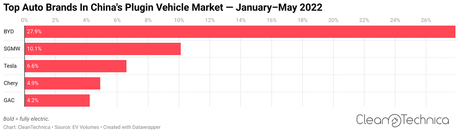 Загальна частка електрокарів в структурі продажів авто в травні досягла 31%. Причому на повністю електричні моделі (BEV) припадає 23% продажів авто в Піднебесній. За підсумками 5 місяців 2022 року частка електрокарів становить вже 25% (з них 20% припадає на BEV).