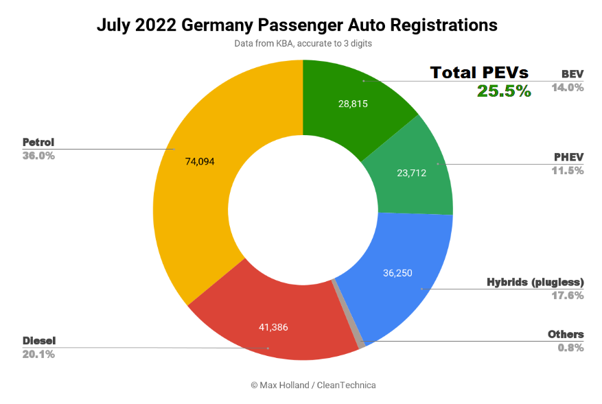 Продажі електромобілів в Німеччині, яка є найбільшим авторинком в Європі, у липні сягнули 25,5% загальної кількості реєстрацій легковиків, повідомляє Clean Technica. В липні 2021 року цей показник становив 22,6%.