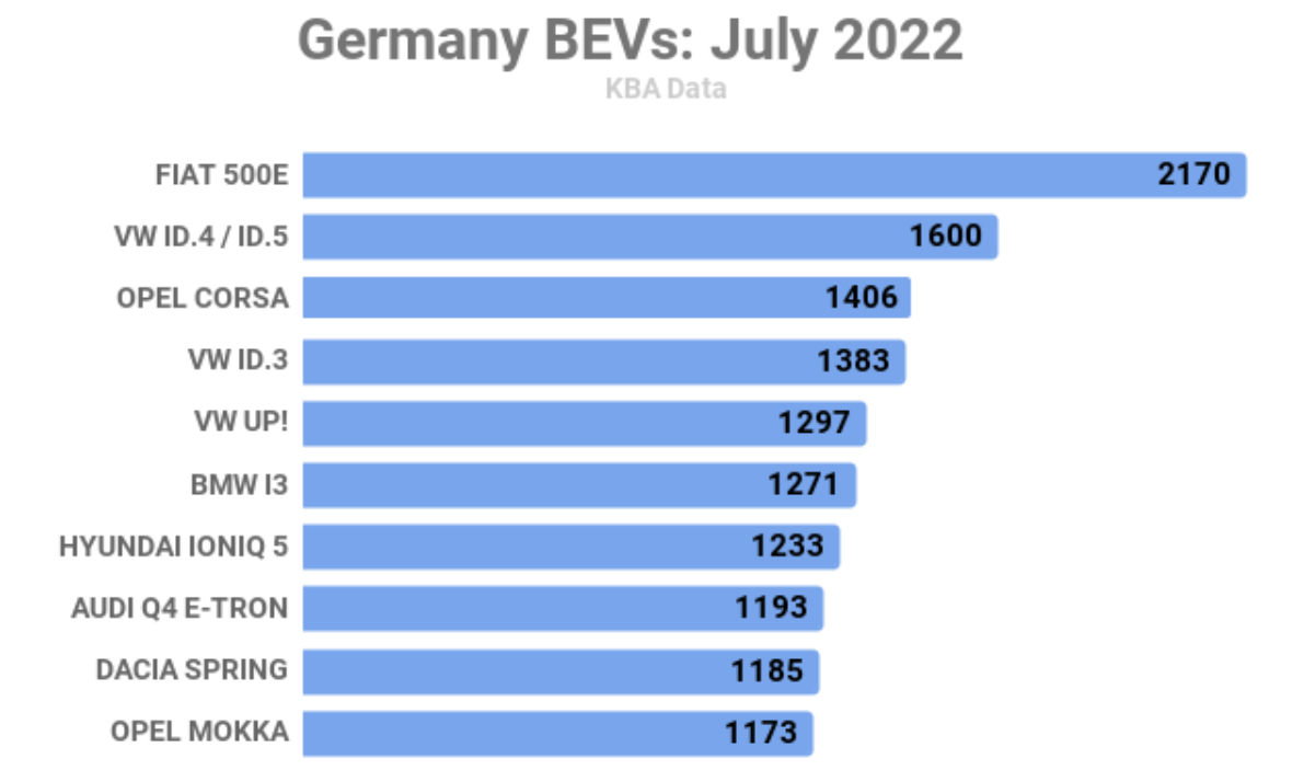 Fiat 500e в липні знову став найбільш продаваним повністю електричним автомобілем у Німеччині. Жодна модель Tesla навіть не увійшли до топ-10 у зв’язку з тим, що компанія має проблеми з логістикою. Для електрокарів бренд Volkswagen липень був вдалим місяцем: вони посіли 2, 4 і 5 позиції в першій десятці.