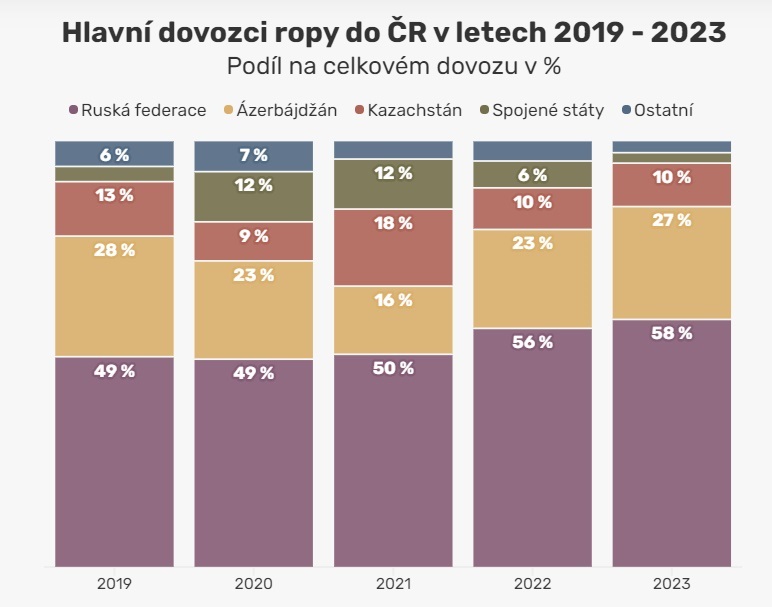 Бі більше, поставки з РФ значно зросли після початку повномасштабної війни Росії з Україною. У порівнянні з 2020-м роком частка російської нафти в структурі імпорту до Чехії збільшила на 9 відсоткових пунктів. У 2019-му та 2020-му на нафту з Росії припадало 49% імпорту, у 2021-му — 50%, а в 2023-му — вже 58%.