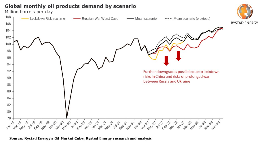 Війна в Україні, карантини у Китаї та різке зростання вартості енергоресурсів суттєво зменшать світовий попит на нафту цього року, що буде стримувати подальше зростання цін на сировину. Як прогнозують аналітики Rystad Energy, світовий попит на нафту за підсумками 2022 року впаде на 1,4 млн бар./добу, опустившись нижче рівня 2019 року. Вони не очікують відновлення попиту до допандемічного рівня принаймні до 2023 року.
