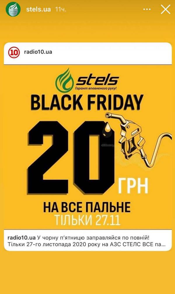 Сеть АЗС Stels 27 ноября на Black Friday проведет акцию - все топливо по 20 грн/л. Об этом говорится в рекламном ролике на местном Радио 10 и в аккаунте оператора в соцести.