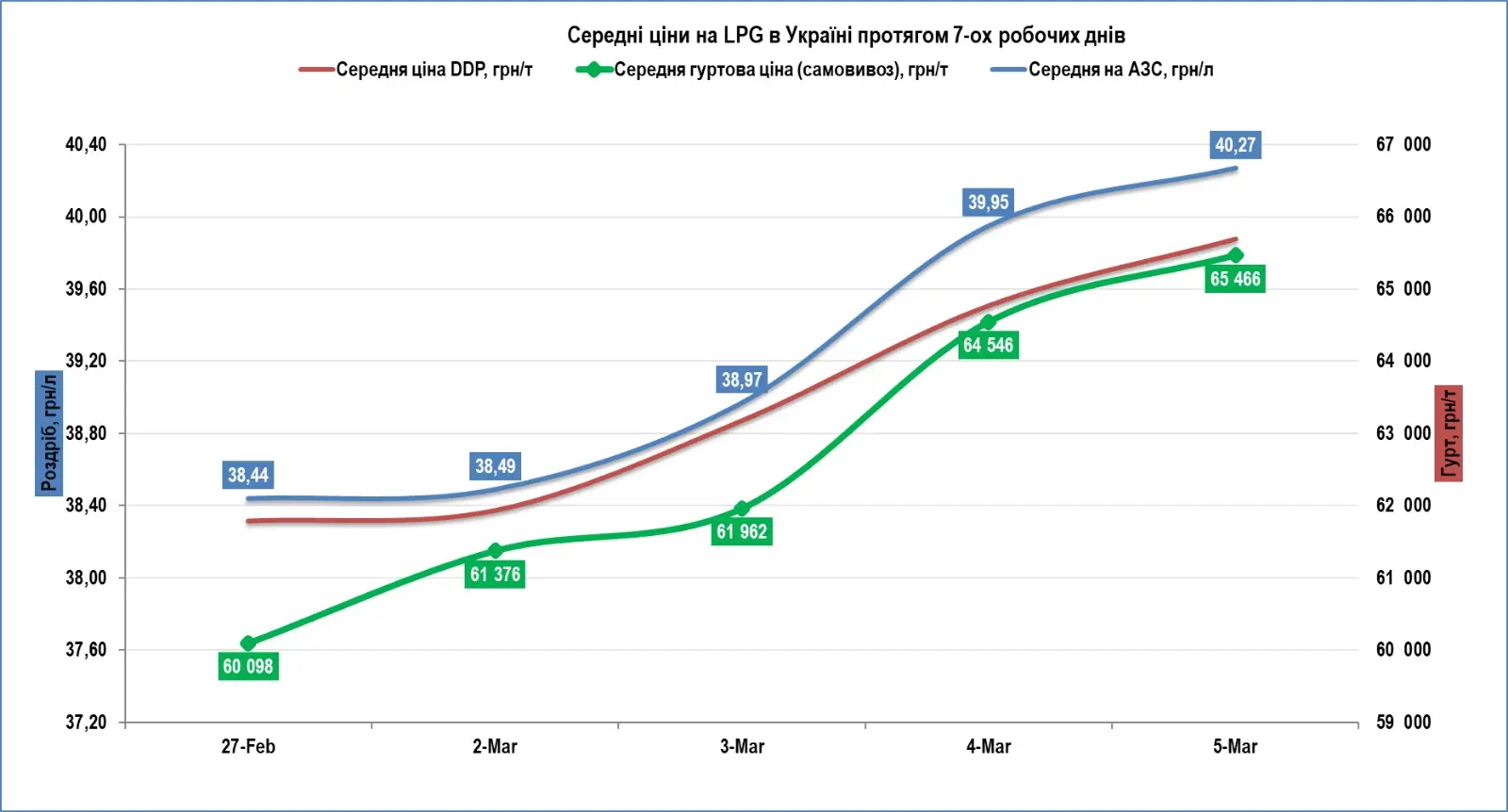 За даними щоденного моніторингу цін на пальне НафтоРинку, середня ціна автогазу на АЗС в Україні 5 березня зросла на 0,32 грн/л і досягла 40,27 грн/л. Від початку тижня автогаз подорожчав у середньому на 1,78 грн/л. Тим часом у деяких великих мережах вартість автогазу вже кілька днів перевищує позначку 40 грн/л.