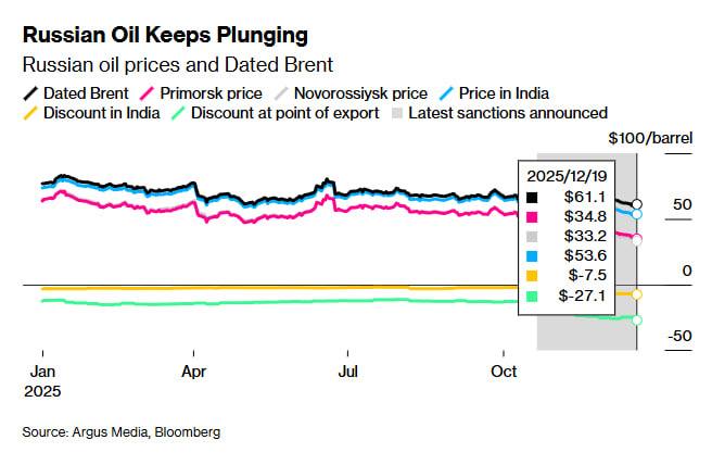 Тим часом знижки на російську нафту ESPO Blend в Китаї у грудні досягли рекордних $5–$6 за барель на тлі падіння попиту, пов'язаного з новими санкціями США.