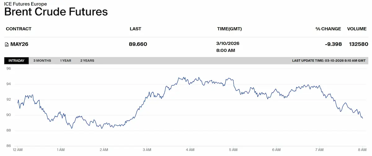 Травневі ф'ючерси на нафту марки Brent впали на 9,4%, до $89,66 за барель станом на 9 ранку за Києвом. Водночас американська нафта West Texas Intermediate (WTI) подешевшала на 9,8%, до $85,46 за барель, свідчать дані біржі ICE.