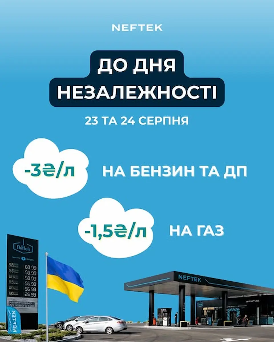 Ukrnafta оголосила про акційну ціну з 21 по 24 серпня – знижки становлять від 1 до 3 грн/л. Компанія також поєднує святкові тарифи з іншими програмами, тож загальна економія для водіїв може сягати до 10 грн/л.