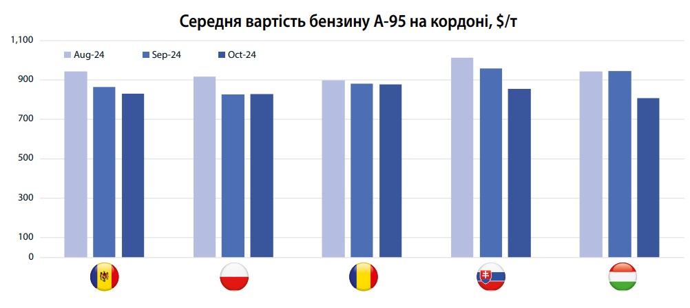 Протягом перших трьох днів листопада найнижчу середню ціну на бензин А-95 серед усіх напрямків імпорту (автотранспортом, морськими суднами та залізницею) зафіксовано на кордоні з Польщею. Вона знизилася на 0,9% (–$7/т) порівняно з третьою декадою жовтня та становила $814/т.