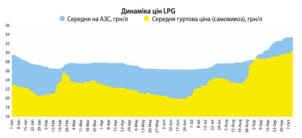 Середня ціна LPG в п’ятницю зросла на 0,03 грн/л порівняно з середою, до 33,57 грн/л ($1181/т без податків). За тиждень приріст сягнув 0,19 грн/л, а за 11 днів жовтня — на 0,84 грн/л. Загалом з початку дії нових ставок акцизу вартість газу зросла на 5,03 грн/л.