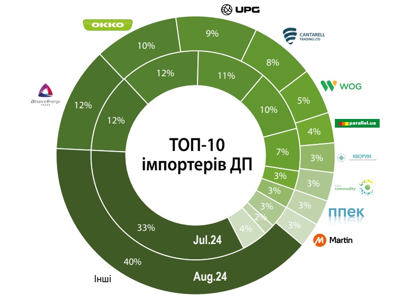Загалом топ-10 імпортерів (груп компаній) сумарно забезпечила 60,3% загальних надходжень ДП у серпні проти 66,8% місяцем раніше.