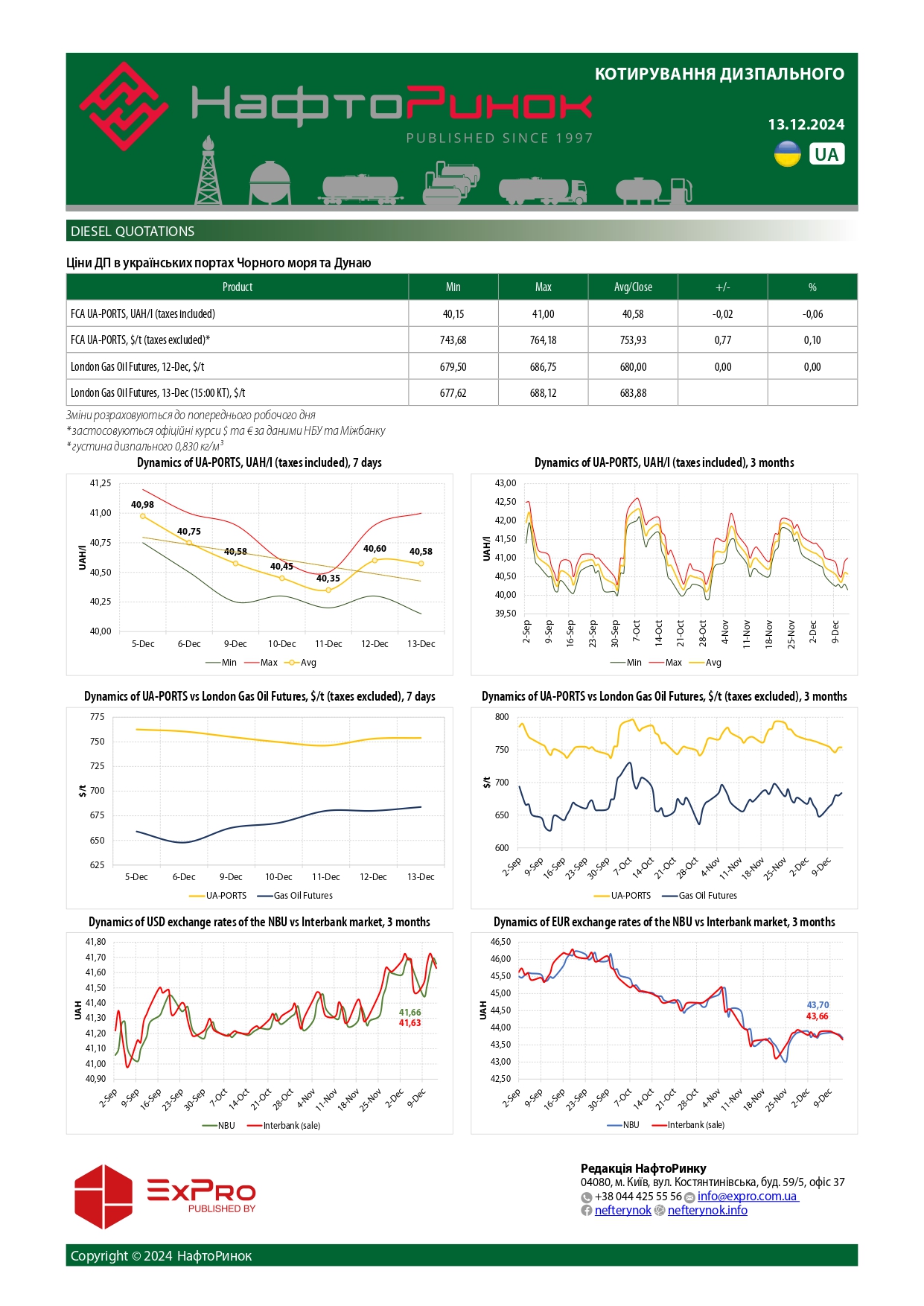 Найнижчий ціновий рівень було зафіксовано в першій декаді грудня (42,88 грн/л). Згідно з даними котирувань НафтоРинку в українських портах (FCA UA-Ports), найменша ціна ДП дрібним гуртом у грудні опускалася до 40,15 грн/л. У цей період була зафіксована максимальна роздрібна націнка (8,94 грн/л).