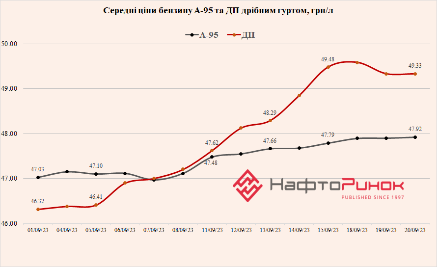 Тенденція до зростання цін на пальне аналогічно відбувається і на українських АЗС. Середня ціна дизпального на АЗС станом на кінець другої декади вересня 2023 р. у порівнянні з початком місяця зросла на 1,71 грн (+3,3%) до 53,58 грн/л. Середня вартість бензину А-95 протягом аналогічного періоду збільшилась на 1,60 грн (+3,1%) до 53,98 грн/л.