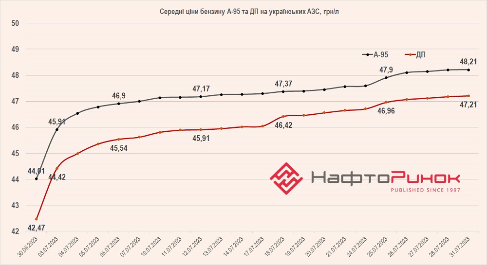Аналогічно до ситуації на ринку дрібного гурту відбулось і зростання пального на українських АЗС. Середня ціна дизпального на АЗС станом на кінець липня 2023 р. у порівняні з кінцем червня зросла на 4,74 грн (+11,16%), до 47,21 грн/л. Середня вартість бензину марки А-95 протягом липня збільшилась на 4,2 грн (+9,54%), до 48,21 грн/л.