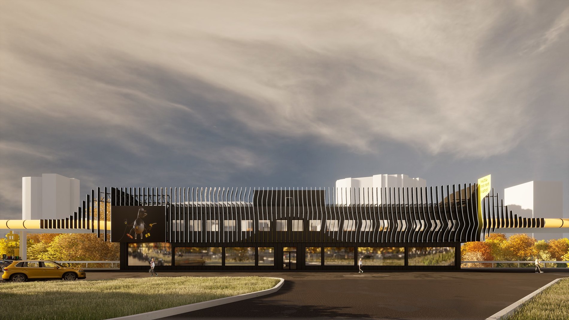 Фасад помещения оформят криволинейными пластинами, которые монтируются одной деталью. Центральная часть комплекса черного цвета «переходить» в белые здания, напоминающие крылья. В выступающие части пластин встроят светодиоды, которые будут светиться ночью и подчеркивать форму здания.