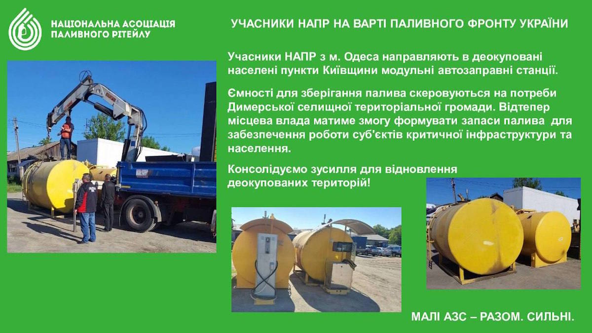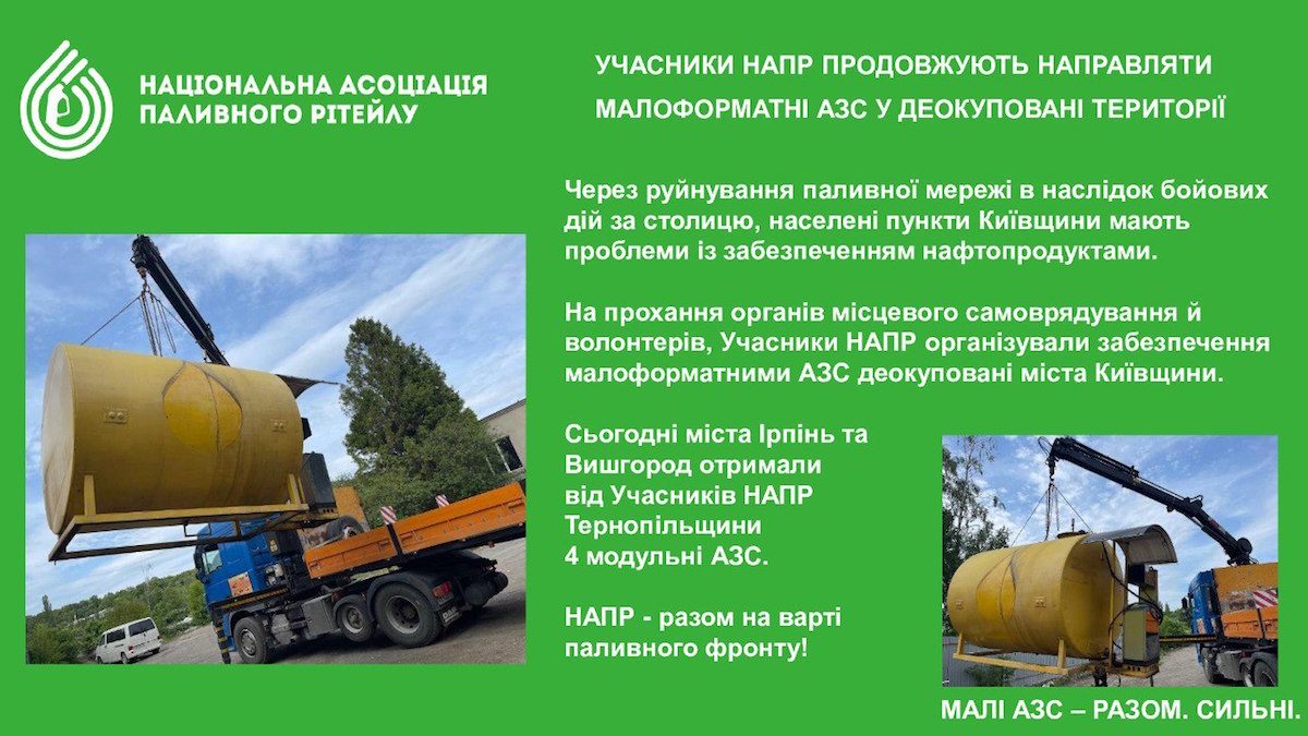У Київський області встановлють модульні АЗС, які перевезено з Тернопільщини та Одеси, повідомляє Національна Асоціація Паливного Ритейлу. «На прохання органів місцевого самоврядування й волонтерів: Учасники НАПР організували забезпечення малоформатними АЗС деокуповані міста Київщини», йдеться в повідомлені. Цього тижня чотири модульні АЗС з’явились в Ірпіні та Вишгороді.