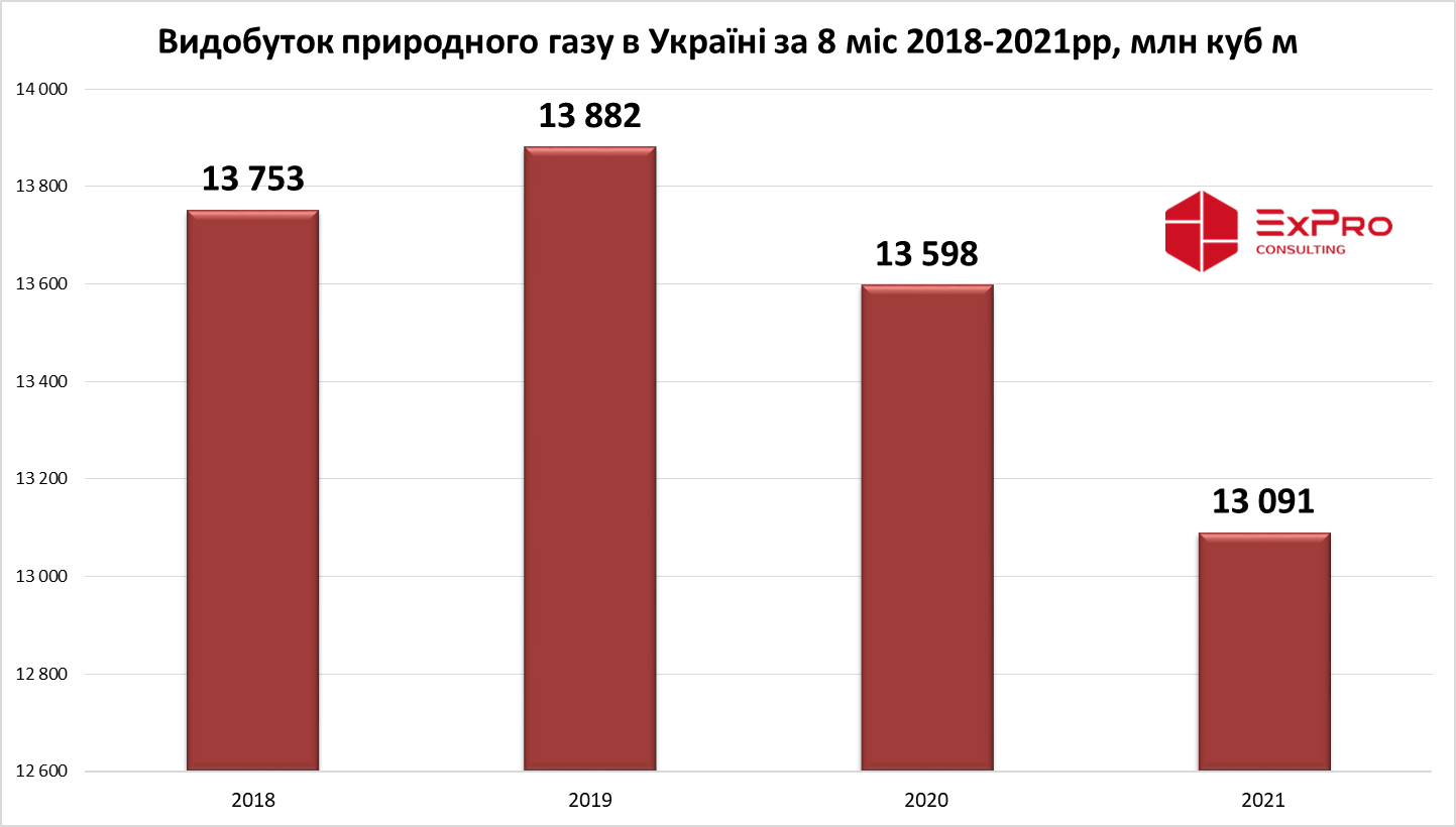 В январе-августе 2021г добыча составила более 13 млрд куб м, на 4% меньше, чем в прошлом году. АО «Укргаздобыча» сократила добычу газа на 5% - до 9,1 млрд куб м. Добыча «Укрнафты» также сократилась примерно на 5% - до 733 млн куб м. В то же время частные компании стабилизировали добычу по итогам 8 месяцев 2021г - на уровне 3,27 млрд куб м.