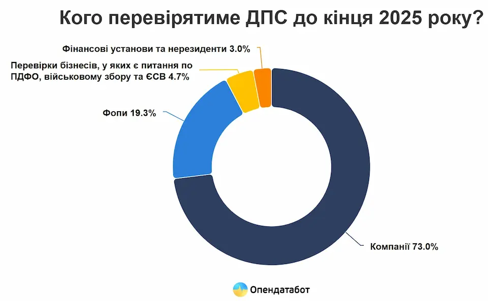 ДПС оновила графік перевірок бізнесу на 2025 рік, збільшивши їхню кількість до майже 5 тис., з яких 80% стосуватимуться компаній, а решта — ФОПів, повідомляє «Опендатабот».