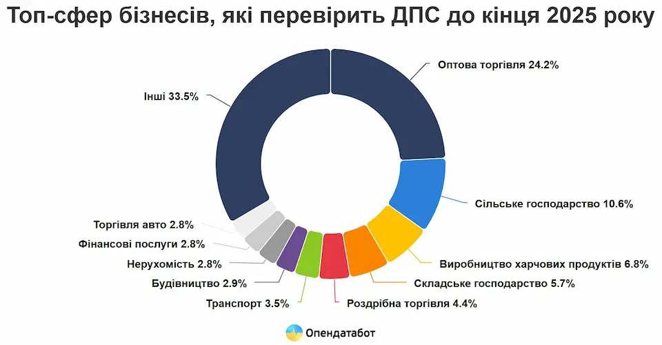 Найбільше до кінця року перевірятимуть підприємців, що працюють у сфері гуртової торгівлі (272 компанії, або 24%), сільського господарства (119, або 11%), виробництва харчових продуктів (76 або 7%), складського господарства та логістики (64, або 6%) та роздрібної торгівлі (49, або 4%).
