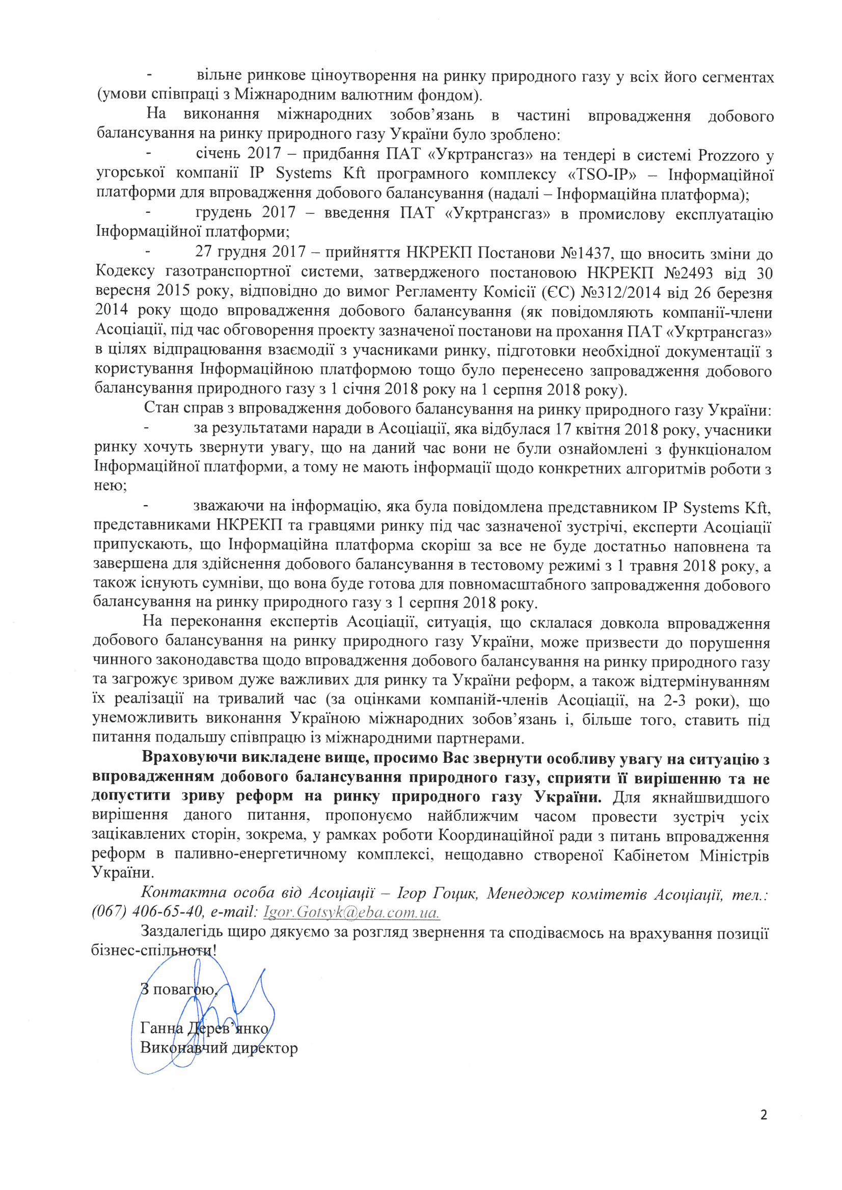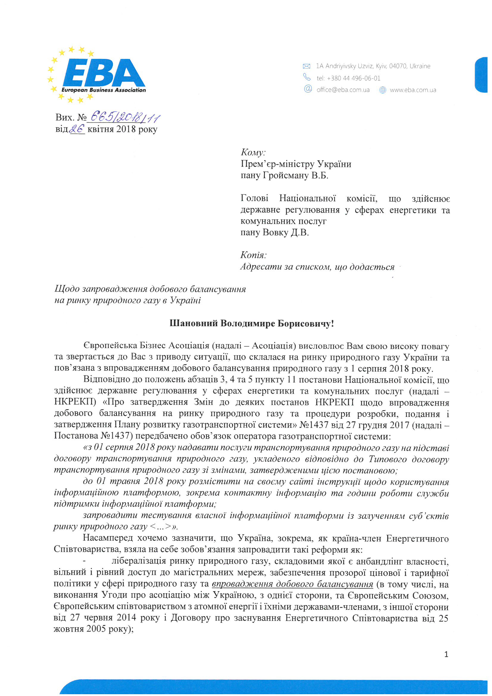 Европейская бизнес Асоциация (EBA) обратилась к премьер-министру В.Гройсману с просьбой вмешаться в процесс имплементации суточной балансировки природного газа, которая может быть сорвана.