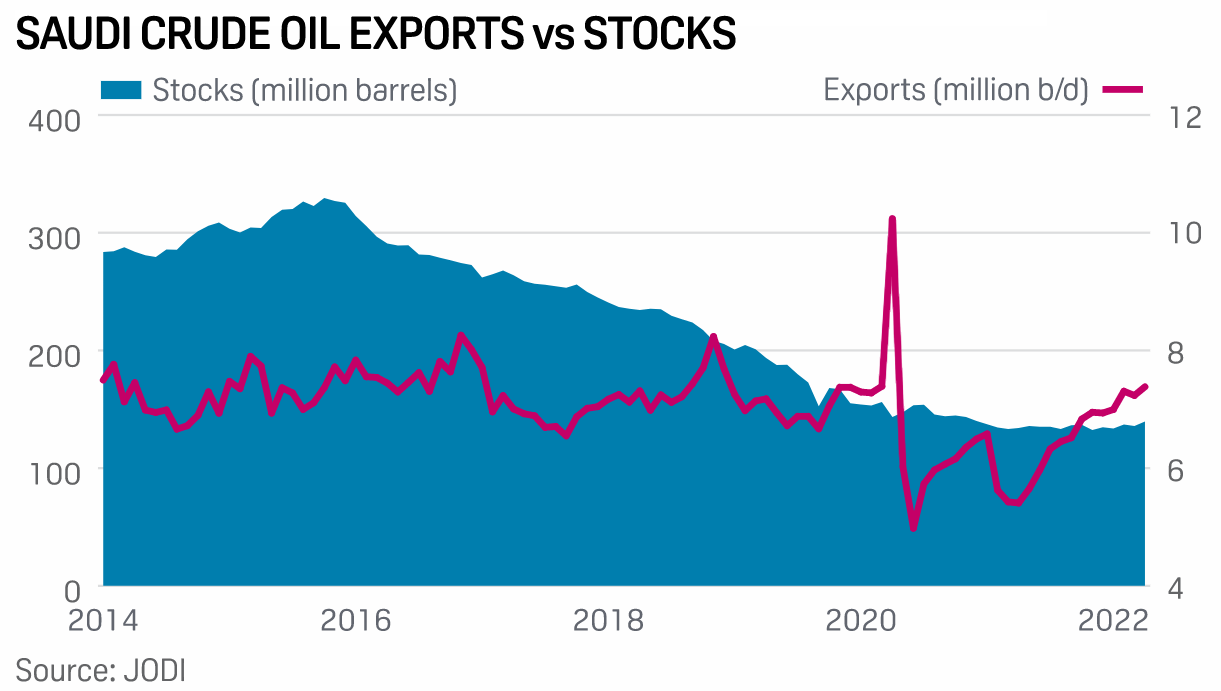 Згідно з даними JODI, опублікованими 20 червня, Саудівська Аравія експортувала в квітні 7,382 млн бар./добу, тоді як в березні - 7,235 млн бар./добу. Експорт у квітні 2020 року сягнув найвищого рівня з квітня 2020 року, коли країна встановила історичний рекорд поставок на рівні 10,237 млн бар./добу.