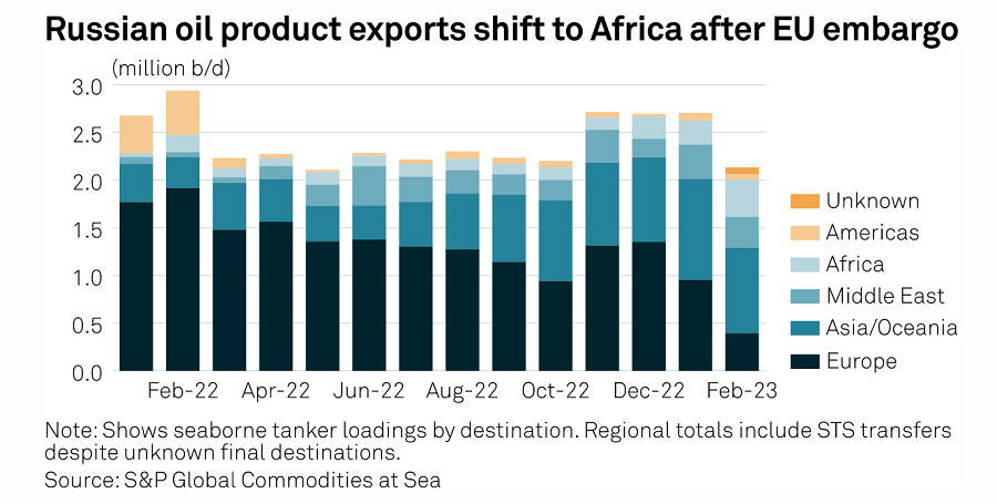 Згідно з даними Platts, російський експорт дизельного палива в лютому впав більш ніж на 100 тис. барелів на добу, до 830 тис. барелів на добу, тоді як експорт мазуту скоротився приблизно на 170 тис. барелів на добу, до 614 тис. барелів на добу.