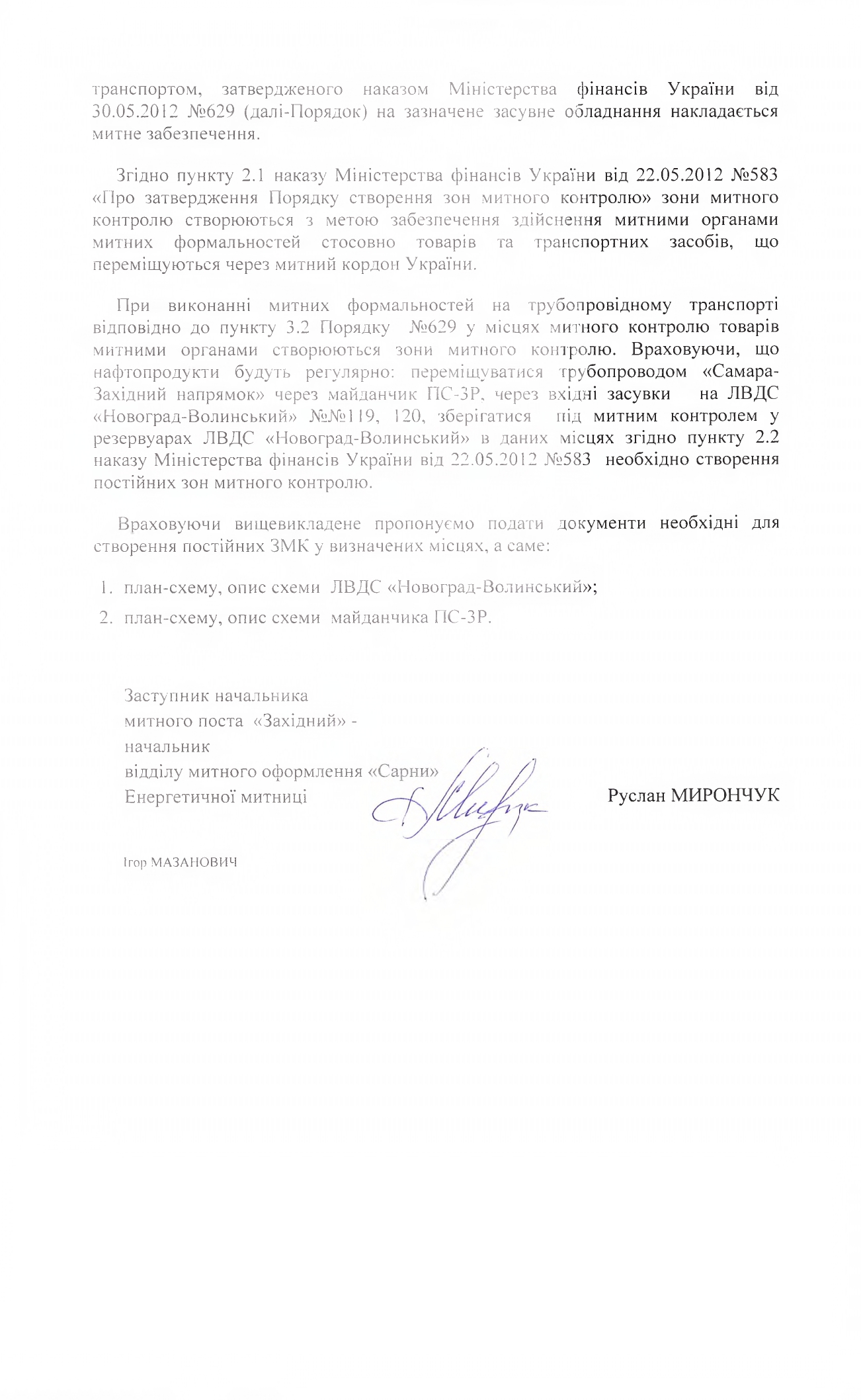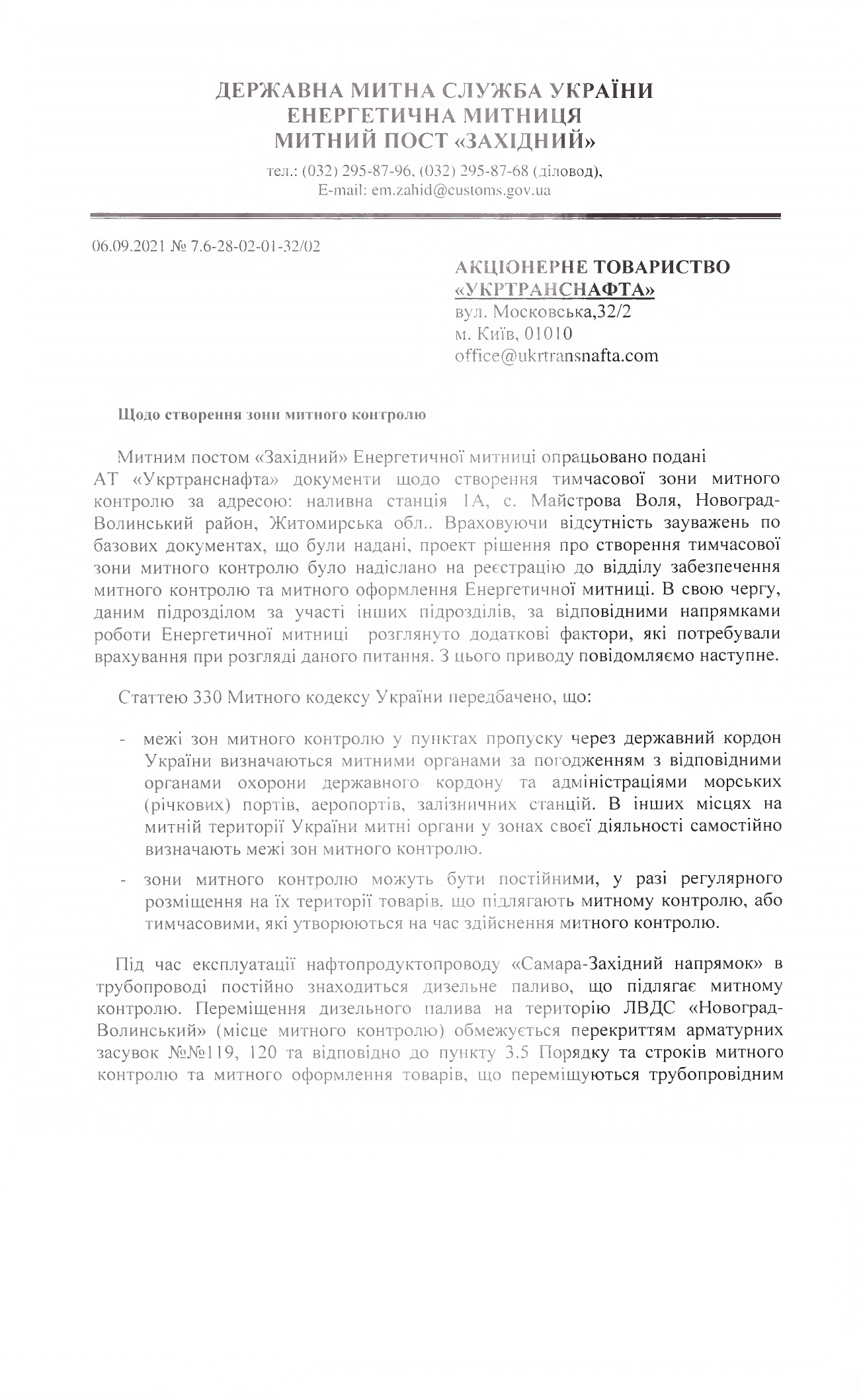 Энергетическая таможня предложила АО «Укртранснафта» подать документы для создания двух постоянно действующих зон таможенного контроля для работы «Прикарпатзападтранс». Об этом сообщили в Энергетической Таможне.