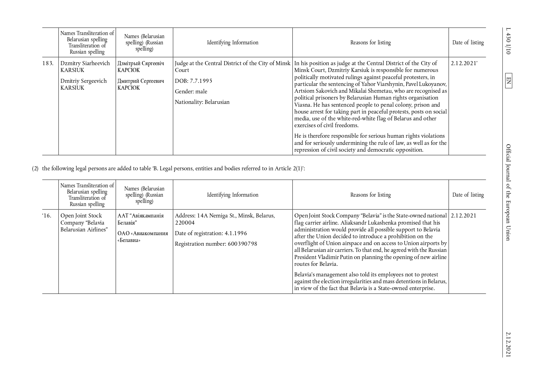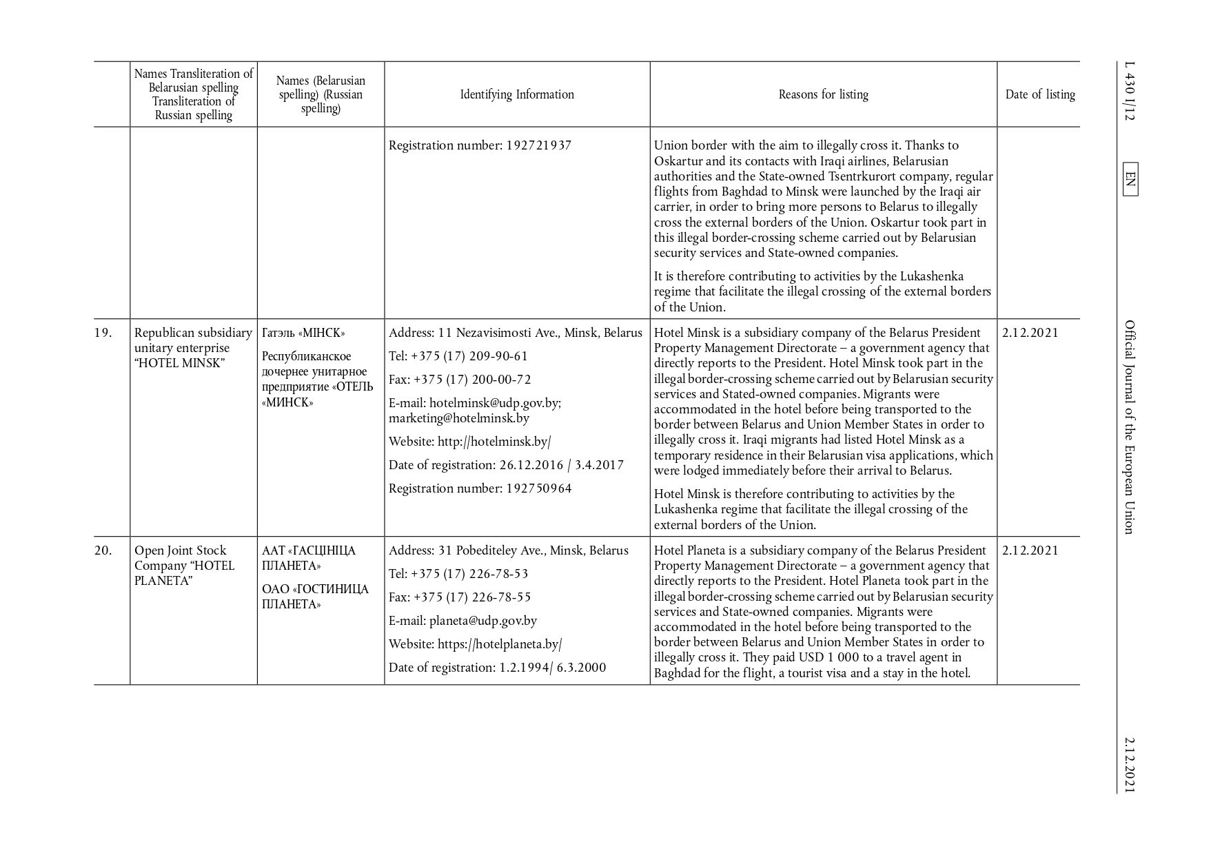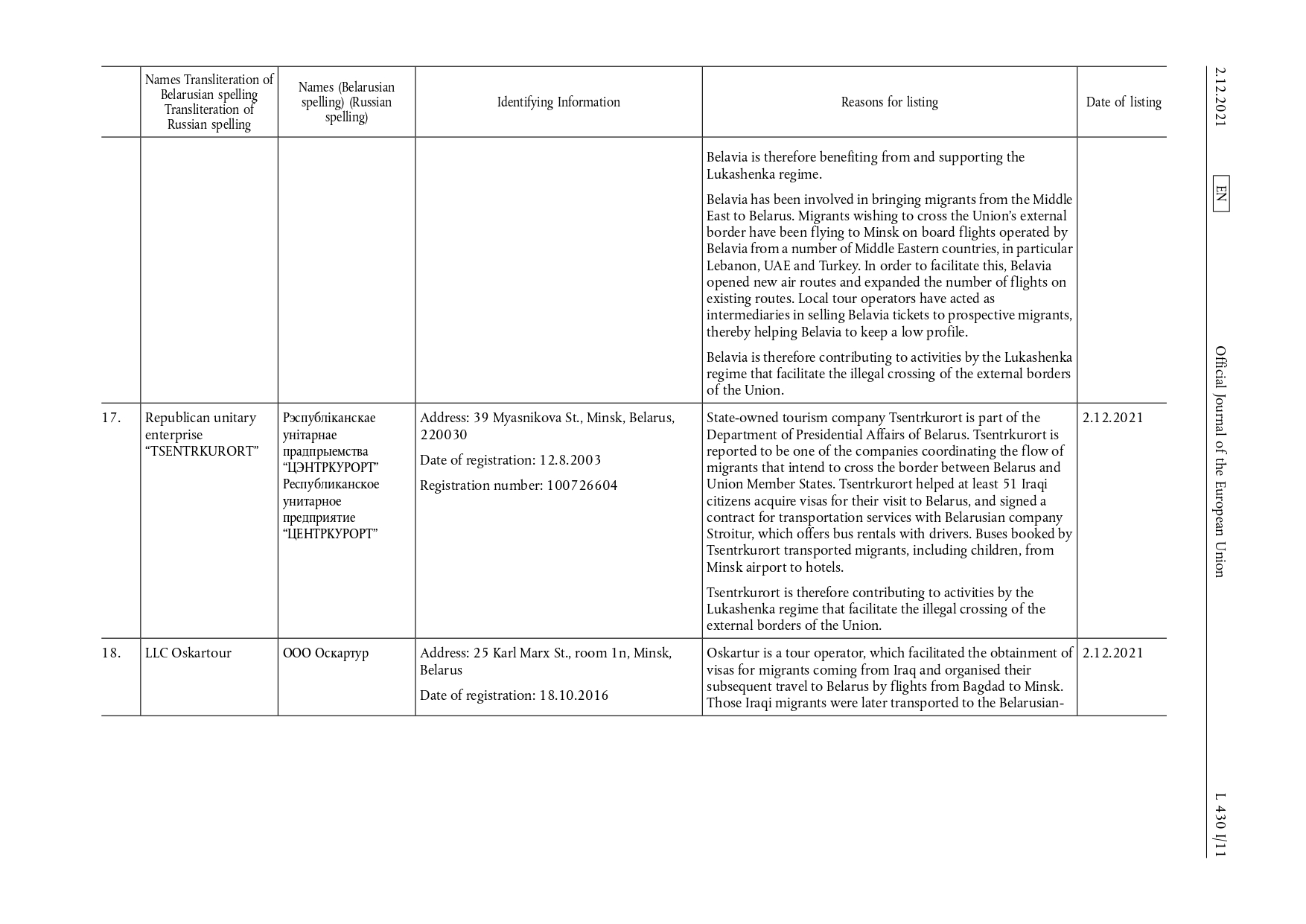 Совет Европейского союза ввел санкции в отношении 17 физических и 11 юридических лиц, которые вступили в силу 2 декабря 2021 г.