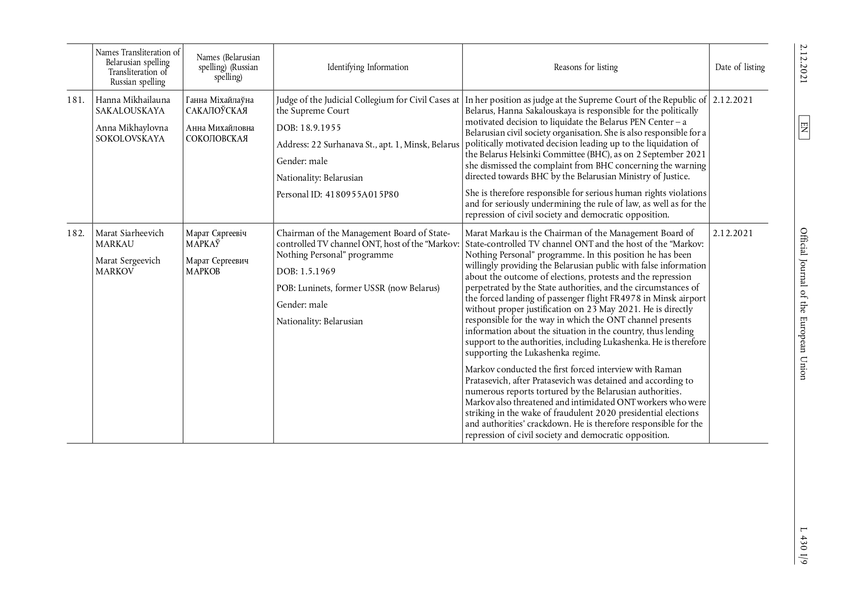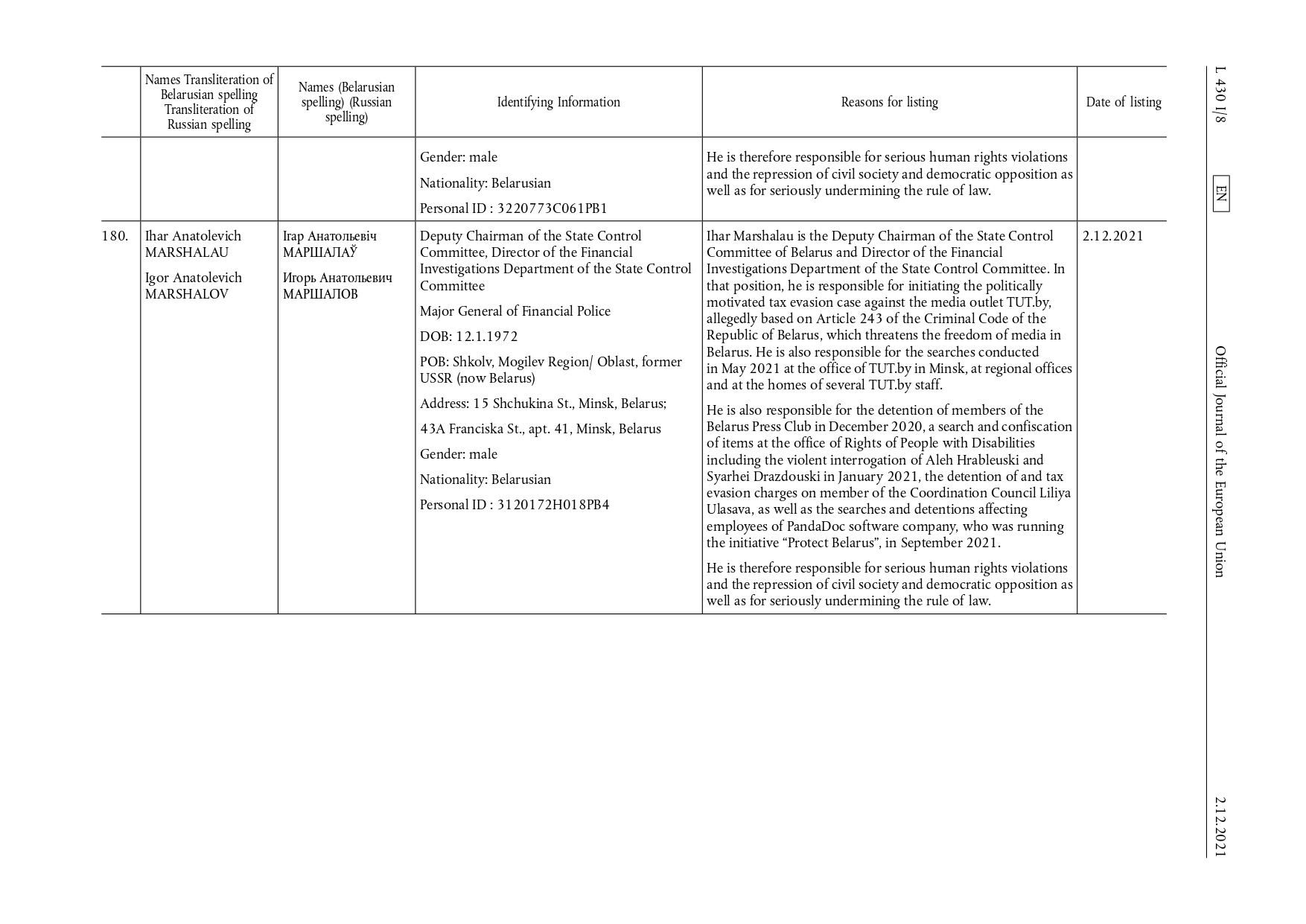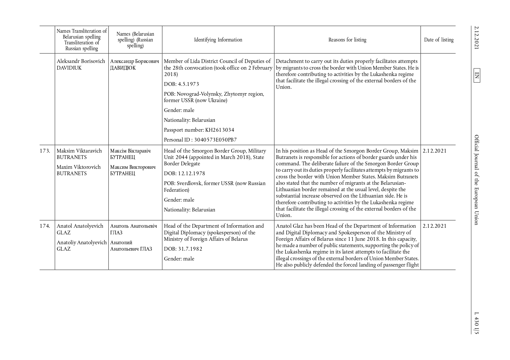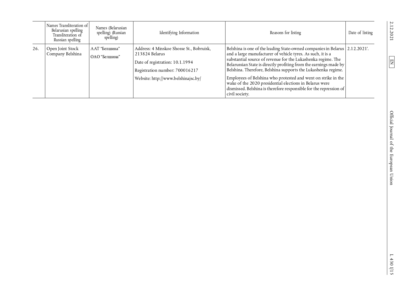 Совет Европейского союза ввел санкции в отношении 17 физических и 11 юридических лиц, которые вступили в силу 2 декабря 2021 г.