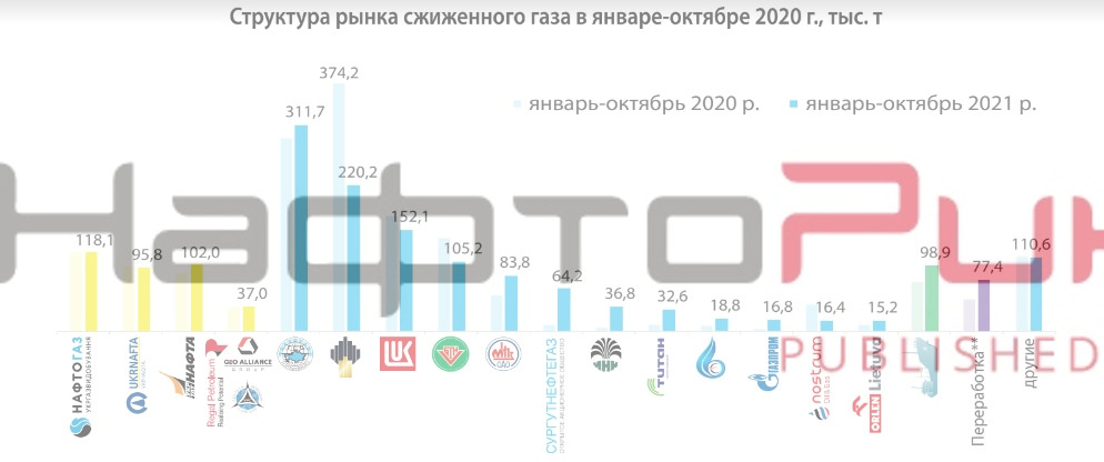 По данным НефтеРынка, «Беларуснефть» является четвёртым по объемам потавщиком пропан-бутана в Украину - 105,2 тыс. т поставок с Речицкого газоперерабатывающего завода за январь-октябрь 2021 г, что составляет 6,1% рынка СУГ Украины.