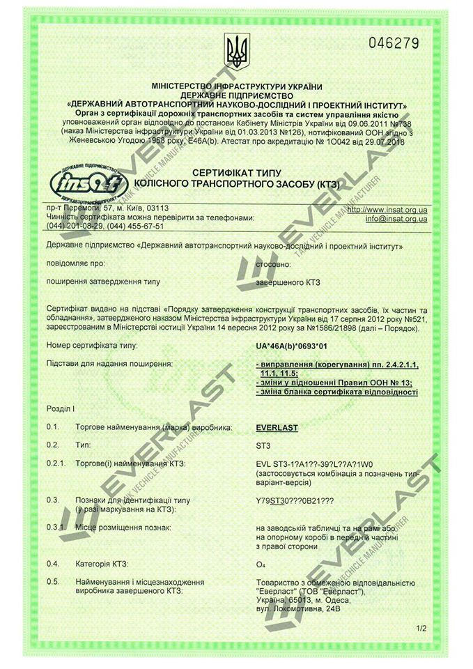 Министерство Инфраструктуры Украины выдало ООО «Эверласт» «Сертифікат типу Колісного транспортного засобу (КТЗ) ST3». Об этом сообщили в компании.