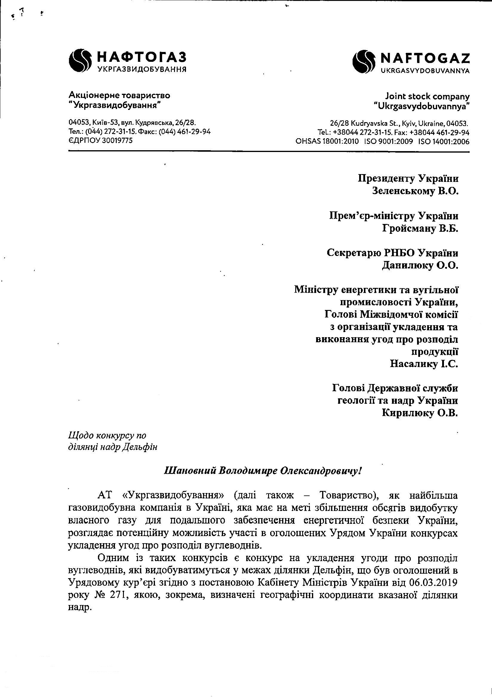 Глава интегрированного газового бизнеса «ГАЗ» НАК «Нафтогаз Украины» Андрей Фаворов просил Президента Зеленского, Главу РНБО, министра энергетики Насалика, а также главу Госгеонедр Кирилюка остановить или отменить конкурс на заключение СРП по морскому участку «Дельфин». Это следует из документов, которые есть в распоряжении НефтеРынка.