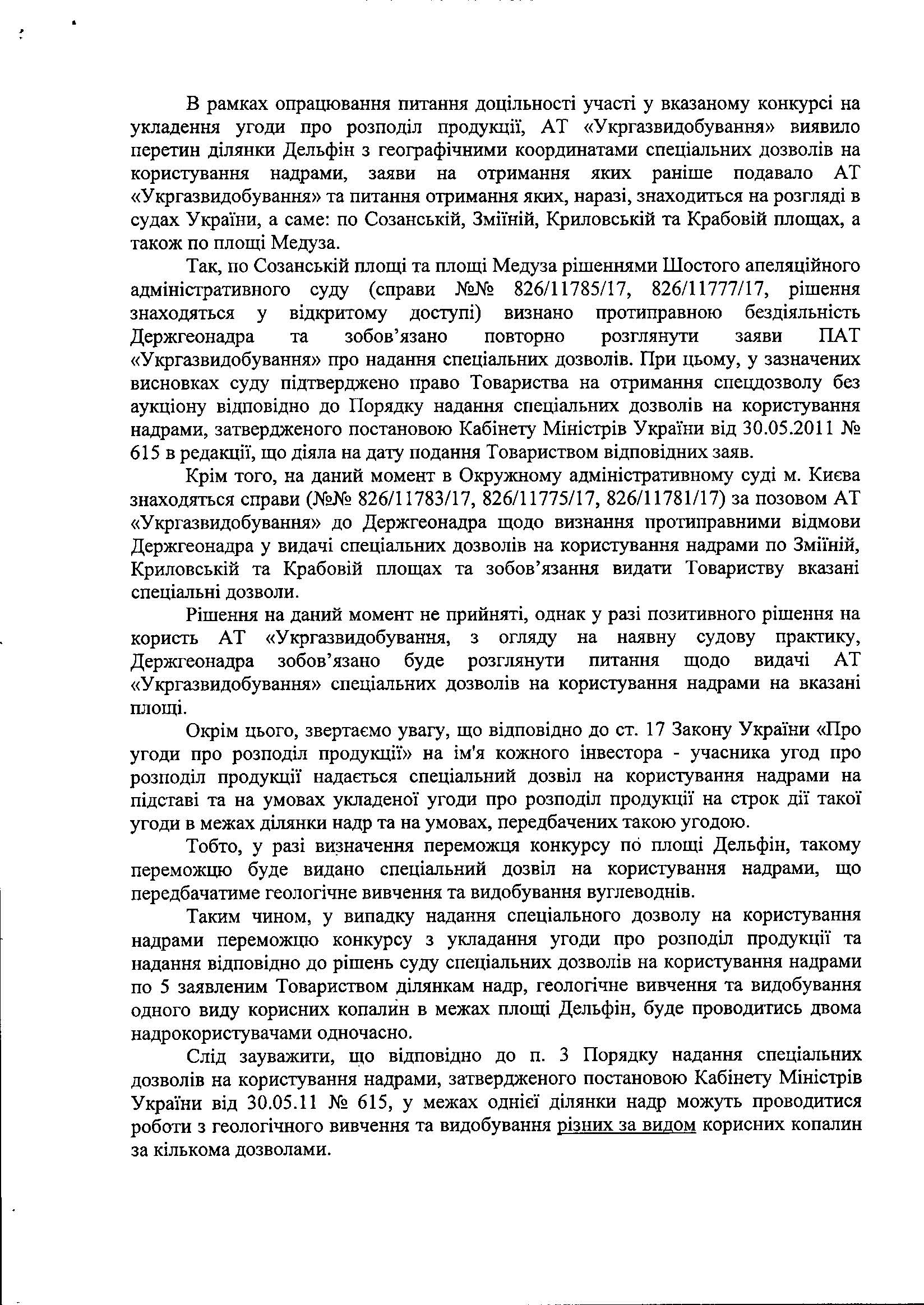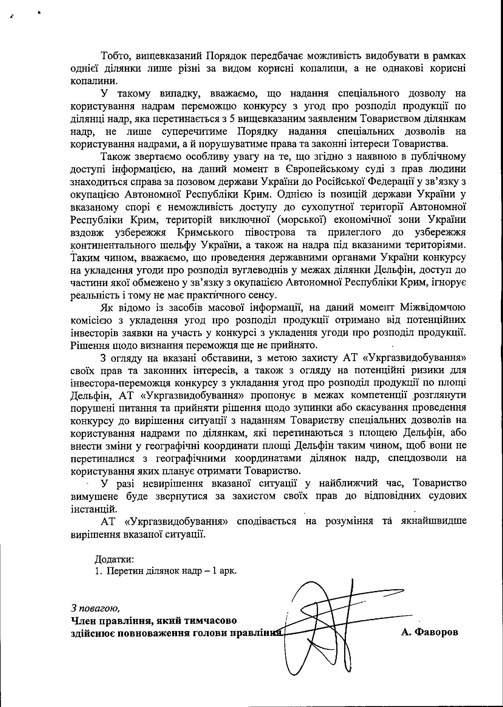 Участок «Дельфин» включает в себя данные площади, что в случае реализации конкурса на заключение СРП фактически нарушает права «Укргаздобычи» и вынуждает общество обращаться в судебные инстанции. В качестве альтернативы срыва конкурса, в компании предложили внести изменения в географические координаты выделив спорные участки.