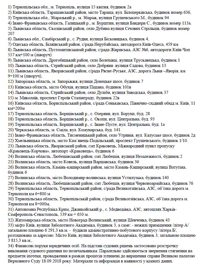 ФГВФЛ предложит 1 лот по кредитным договорам АО «Фортуна-банк» №1-0020/13/30-KL, №1-0021/13/30-KL. Перечень заставленного имущества состоит из 32 объектов недвижимости и оборудования для АЗС, помещений здания в Киеве, и фин поручения юр. лиц.