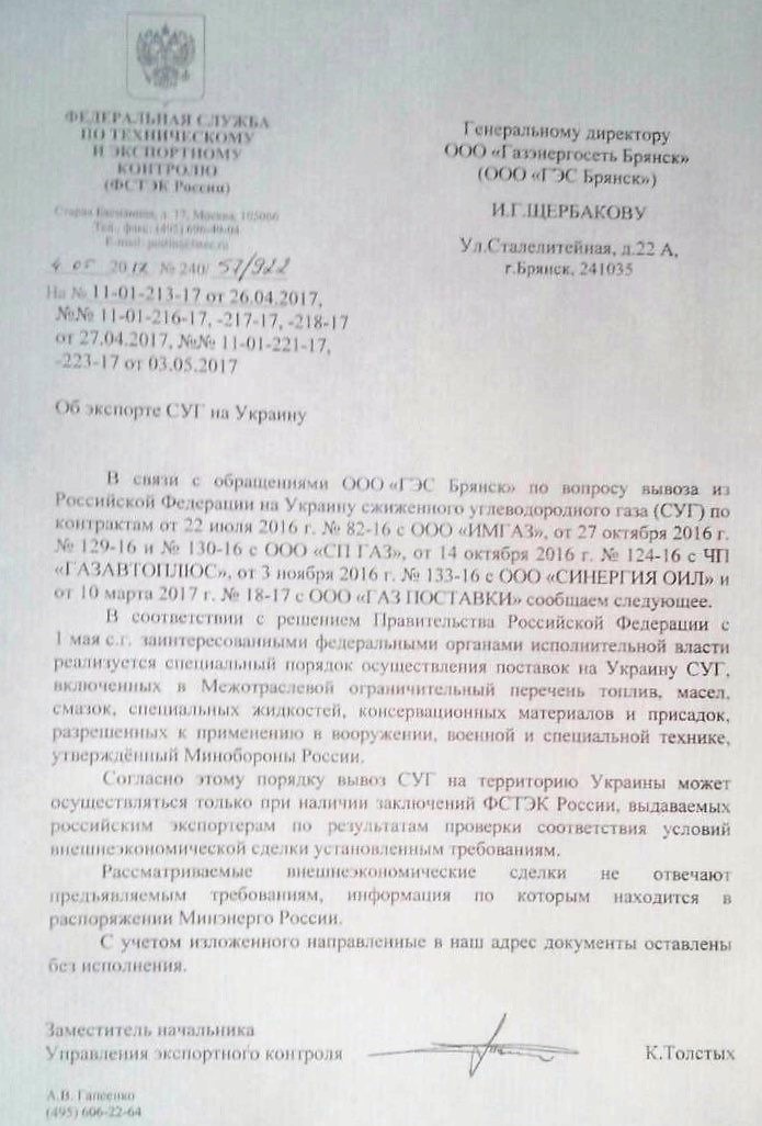 Федеральная служба по техническому и экспортному контролю РФ отказала в поставках сжиженного газа ООО «Газэнергосеть Брянск» («ГЭС Брянск»), которое является подразделением АО «Газпром газэнергосети», в адрес украинских импортеров.