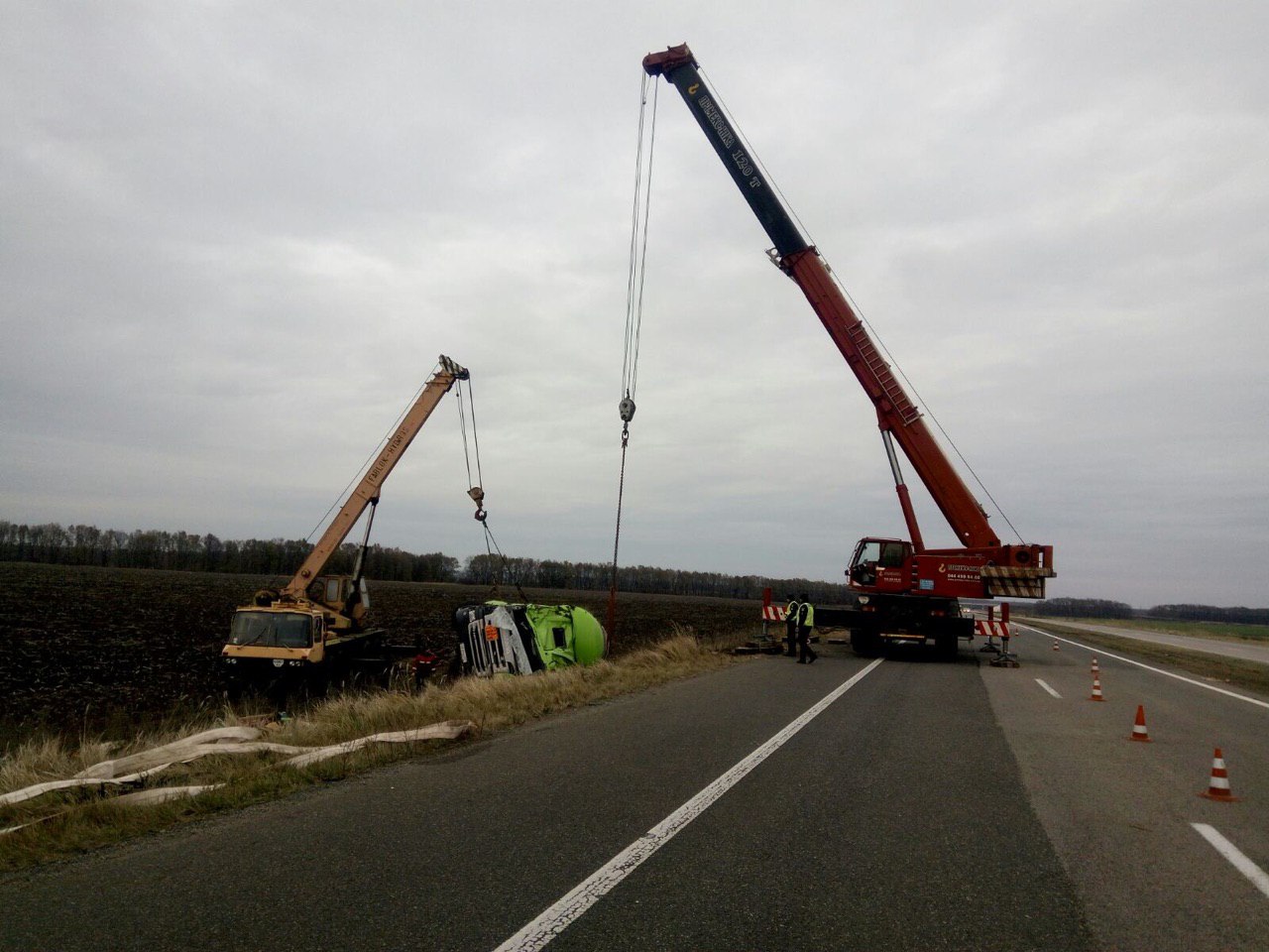 3 ноября грузовой автомобиль изъят из кювета. Личным составом проводился мониторинг во время перекачки пропан-бутана с поврежденной цистерны.