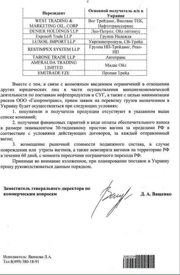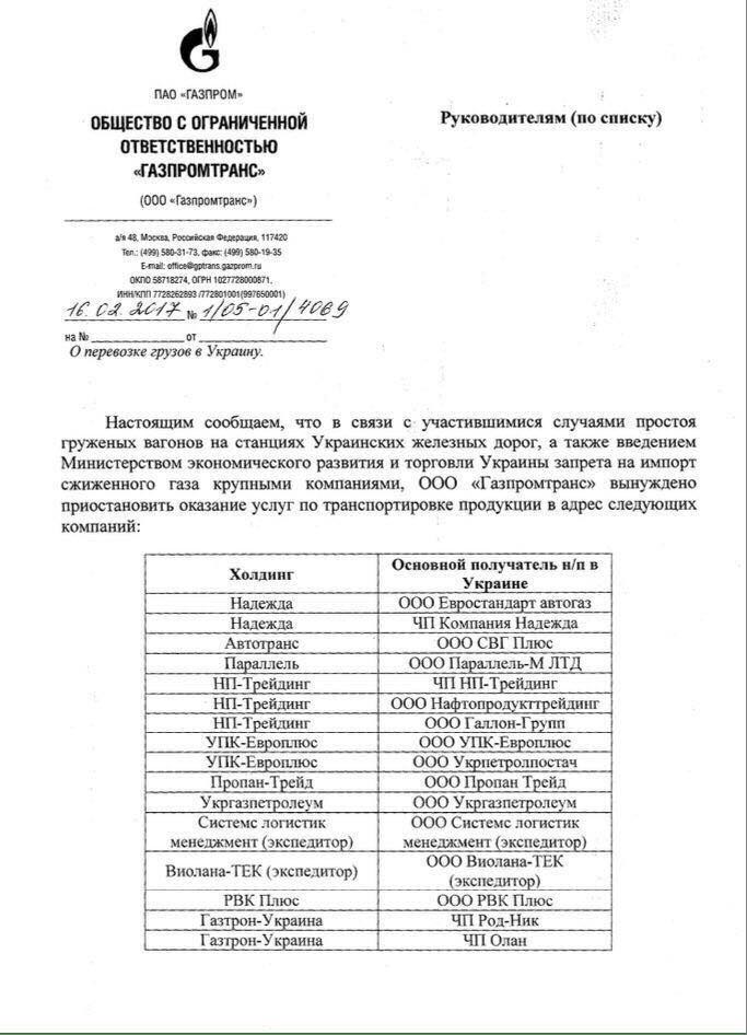 В документе «Газпромтранс» сообщает, что в связи с участившимися случаями простоя цистерн на территории Украины, компания вынуждена приостановить отгрузку в адрес украинских компаний и их нерезидентов, которые попали под санкции Миэнеконоразвития.