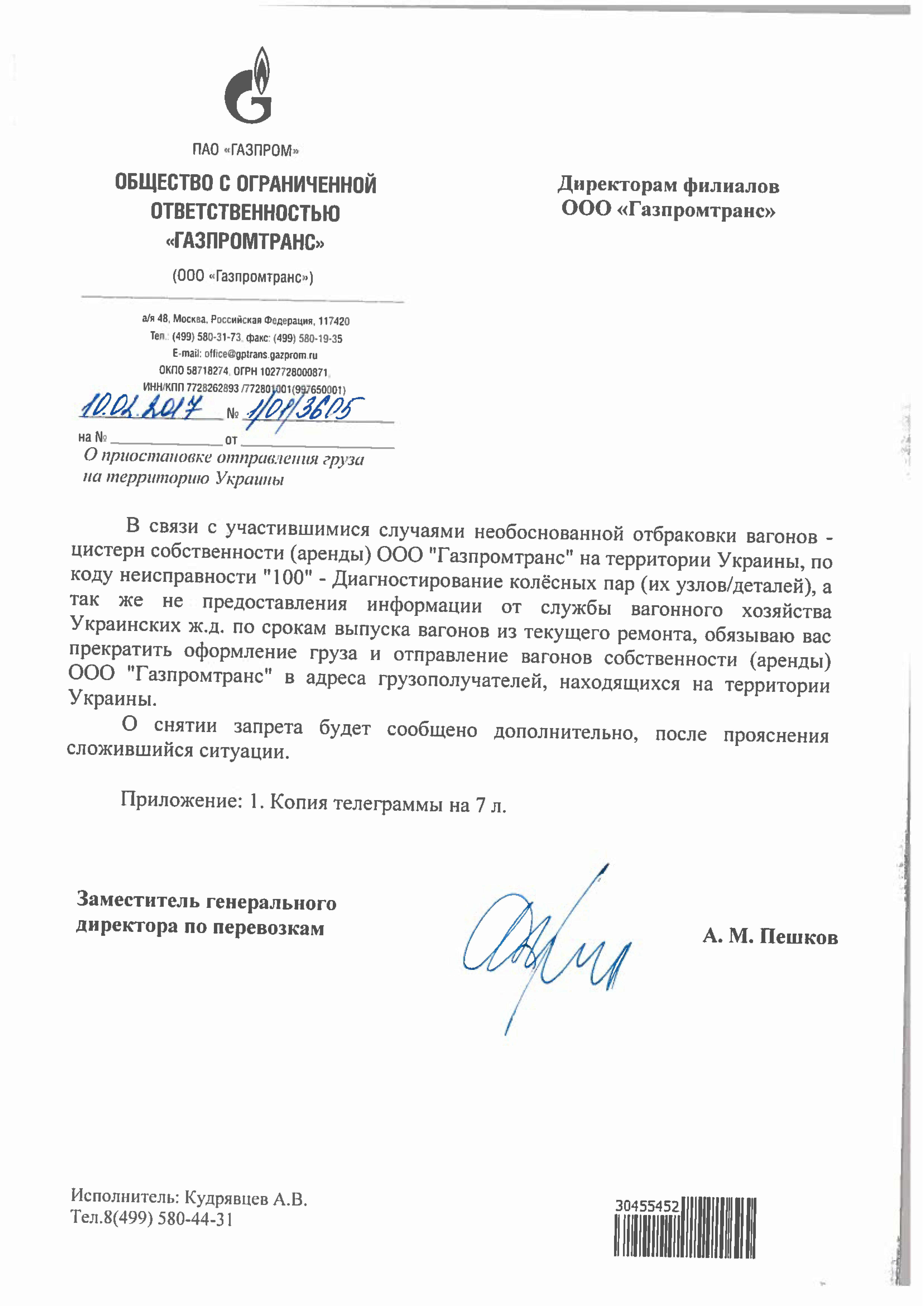 В компании сообщают, что приостановка отправления груза на территорию Украины введена в связи с участившимися случаями необоснованной отбраковки вагонов – цистерн собственности ООО «Газпромтранс» на территории Украины, по коду неисправности «100» - Диагностирование колесных пар из (узлов/деталей) а также не предоставления информации от службы вагонного хозяйства Украинских ж/д по срокам выпуска вагонов собственности (аренды) «Газпромтранса» в адреса грузополучателей.